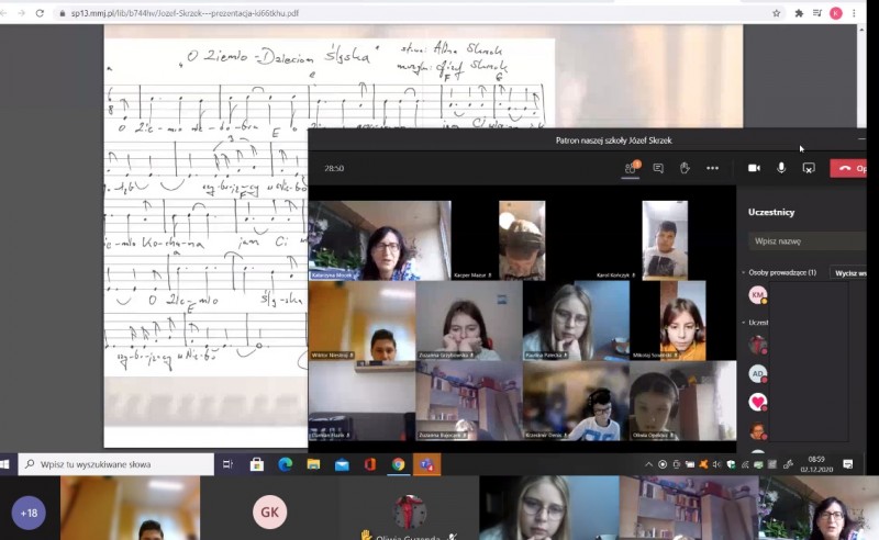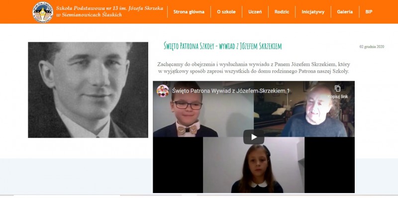 Szczególnym punktem obchodów Dnia Patrona SP13 był wywiad z panem Józefem Skrzekiem, który przeprowadzony został przez uczniów z klas drugich – Antosię i Kacperka. Wywiad, a raczej ciepła, szczera rozmowa udostępniony został na stronie internetowej szkoły ( https://www.sp13.mmj.pl/swieto-patrona-szkoly—wywiad-z-jozefem-skrzekiem ). Wyjątkowym jest fakt, iż miejscem wywiadu był rodzinny dom harcmistrza, w którym Józef Skrzek opowiadał nam o miłości do ziemi śląskiej, a także motywach powstania podarowanej nam pieśni pt. „O Ziemio – Dzieciom Śląska”. Wielokrotnie podkreślał fakt inspiracji osobą stryja, a także mówił o swojej działalności muzycznej i tworzeniu muzyki w czasach pandemii. Podczas tego spotkania padło wiele ważnych słów – najważniejszymi były jednak te, które motywują do pozostawania sobą, realizacji pasji i umiłowania rodzinnych stron.