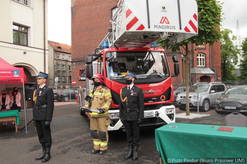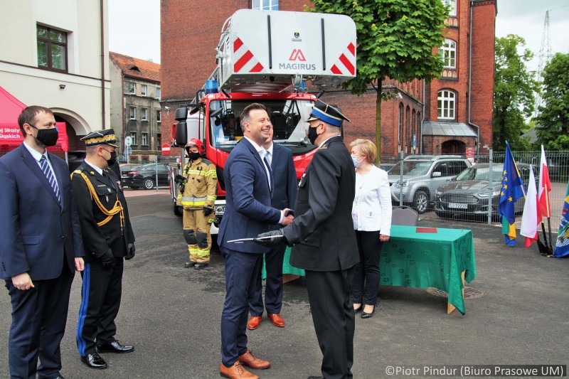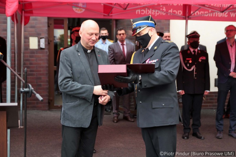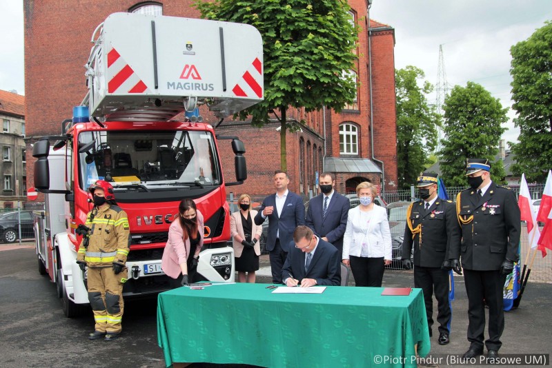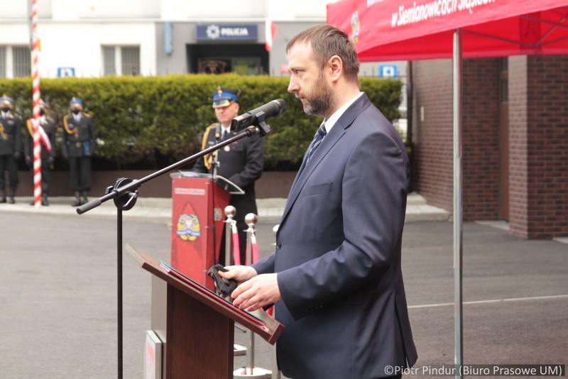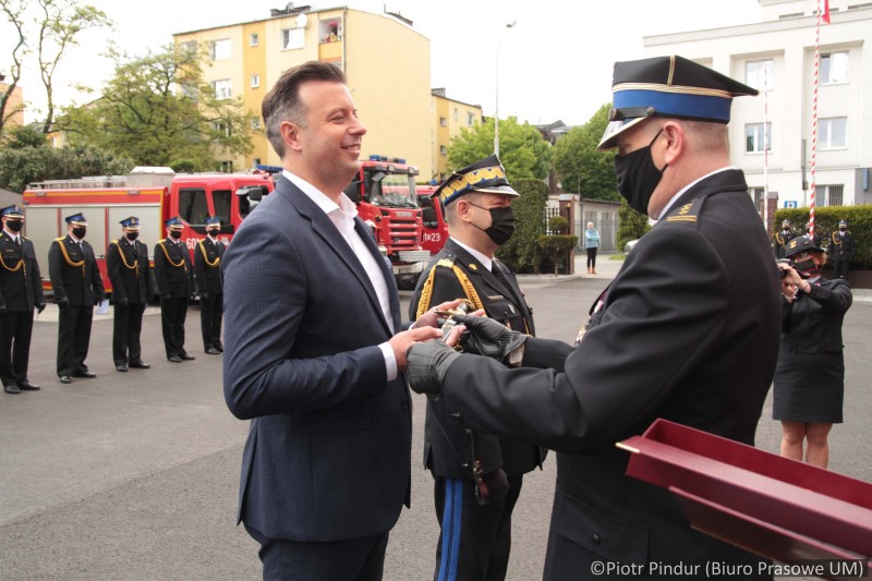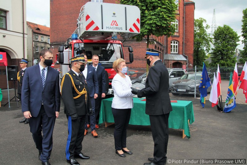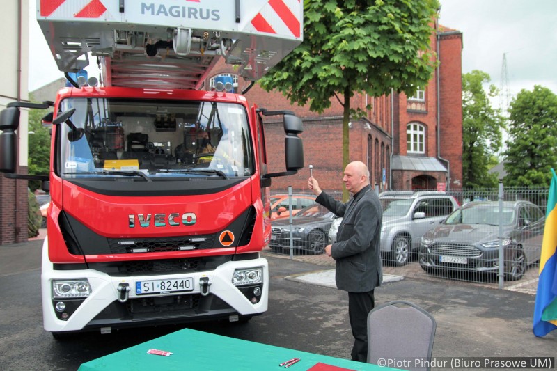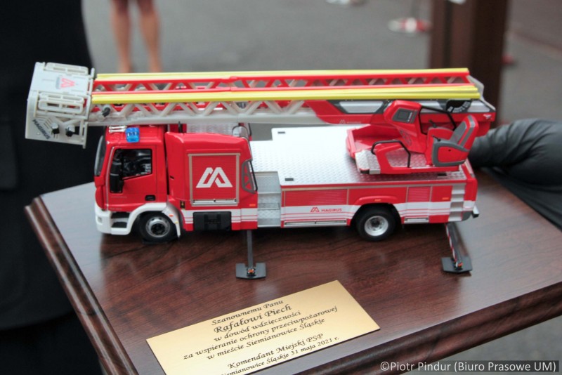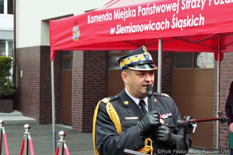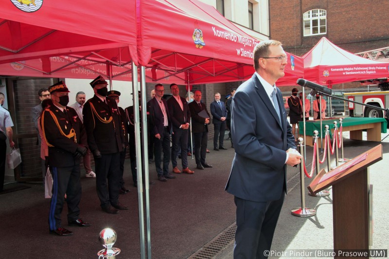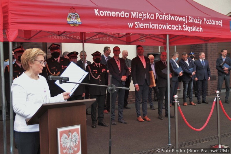 Obchody Dnia Strażaka były okazją do uroczystego przekazania samochodu z drabiną mechaniczną Iveco Magirus SD-42, który został sfinansowany ze środków: Urzędu Marszałkowskiego w Katowicach, Wojewódzkiego Funduszu Ochrony Środowiska i Gospodarki Wodnej w Katowicach, Wojewódzkiego Funduszu Wsparcia Państwowej Straży Pożarnej KW PSP w Katowicach oraz Urzędu Miasta w Siemianowicach Śląskich. Uroczystego przekazania na ręce Komendanta Miejskiego PSP w Siemianowicach Śląskich dokonali: Śląski Komendant Wojewódzki PSP w Katowicach nadbryg. Jacek Kleszczewski, Pełnomocnik Marszałka Województwa Śląskiego ds. współpracy z administracją publiczną Pani Danuta Sobczyk, która na uroczystości reprezentowała Marszałka Województwa Śląskiego Pana Jakuba Chełstowskiego, Prezes WFOŚiGW w Katowicach Pan Tomasz Bednarek, Prezydent Miasta Siemianowice Śląskie Pan Rafał Piech oraz Przewodniczący Rady Miasta Siemianowice Śląskie Pan Adam Cebula.