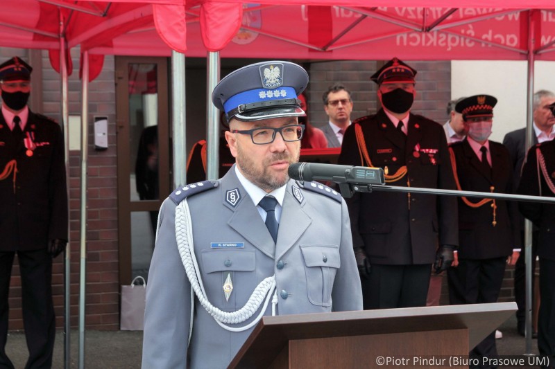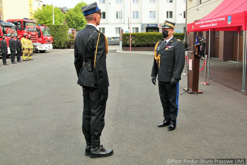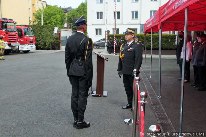 Meldunek o gotowości do rozpoczęcia uroczystej zbiórki Śląskiemu Komendantowi Wojewódzkiemu Państwowej Straży Pożarnej w Katowicach, Panu nadbryg. Jackowi Kleszczewskiemu złożył dowódca uroczystości st. kpt. Kamil Kwandrans, .