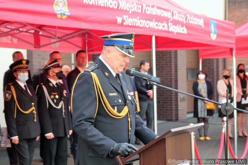 Zaproszonych gości przywitał Komendant Miejski PSP w Siemianowicach Śląskich st. bryg. Rafał Świerczek, który w swoim wystąpieniu uczcił minutą ciszy pamięć strażaków i pracowników cywilnych straży pożarnej, którzy w ubiegłym roku odeszli na wieczną służbę. Następnie podziękował funkcjonariuszom i pracownikom cywilnym za całoroczną służbę i pracę oraz omówił dotychczasowe osiągnięcia.