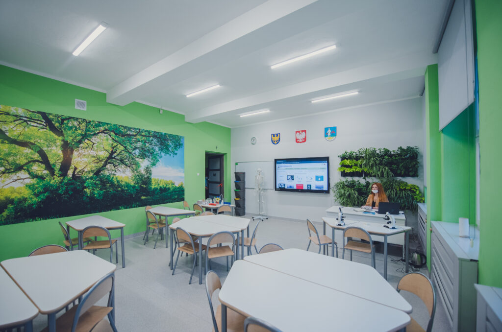„Zielona Piąteczka”to kompletnie odremontowane pomieszczenie, w którym zainstalowano m.in. interaktywne plansze z biologii i chemii, szkielet człowieka, model ucha czy kosze do ćwiczeń i nauki segregacji.