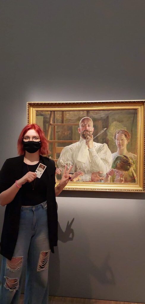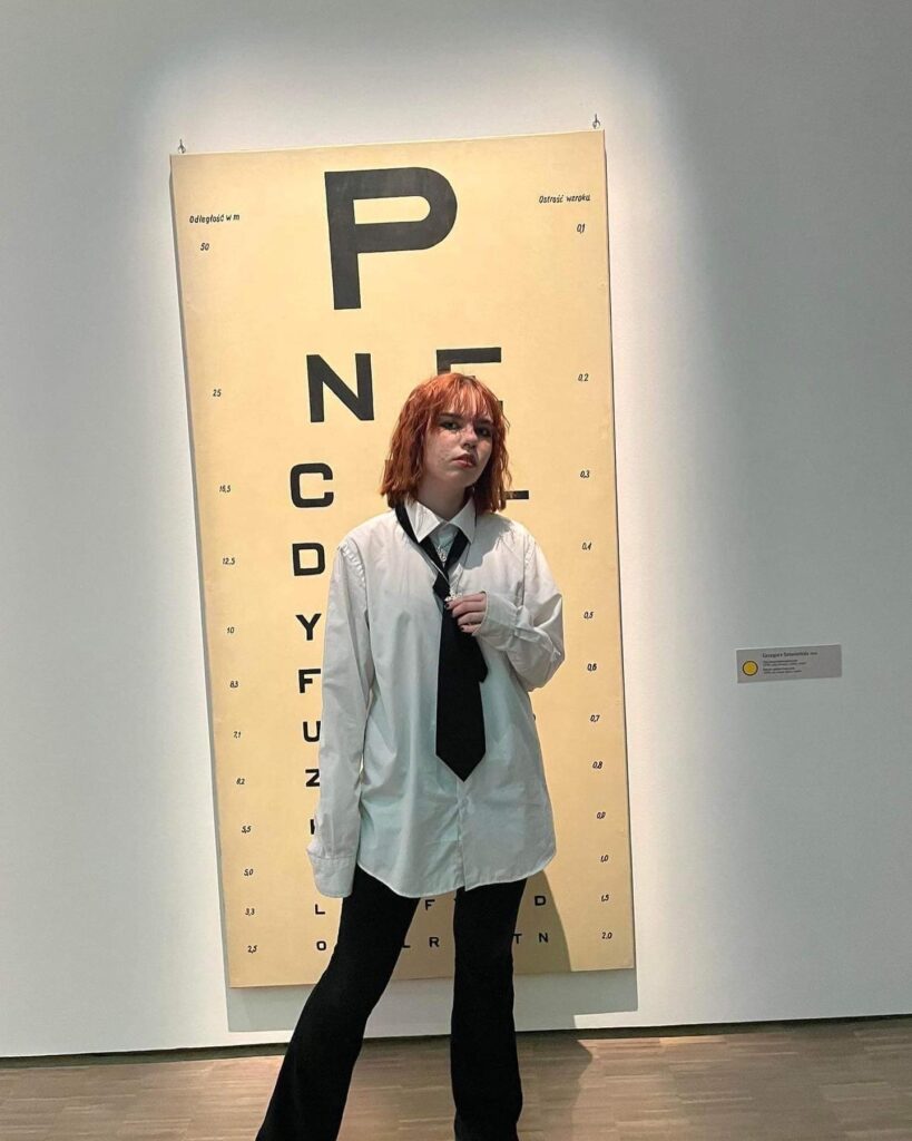 Uczennica w zielonej bluzie i dżinsach stoi trzymając dyplom i swoją pracę plastyczną