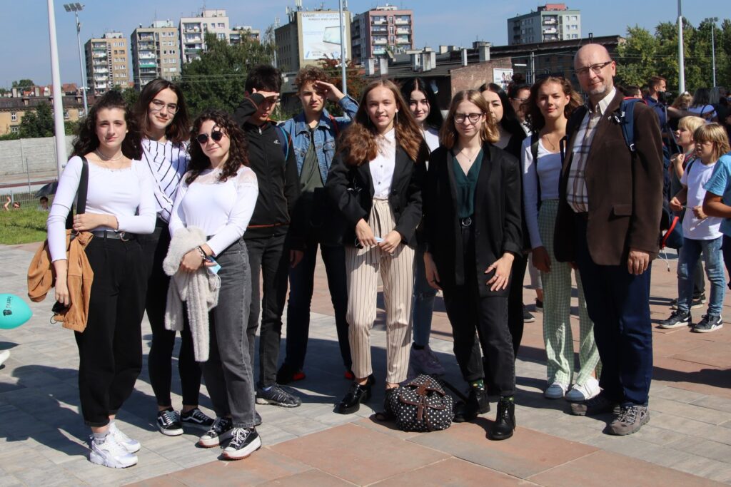 Grupa młodzieży stojąca przed budynkiem z wiszącym transparentem Body Worlds