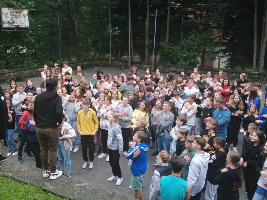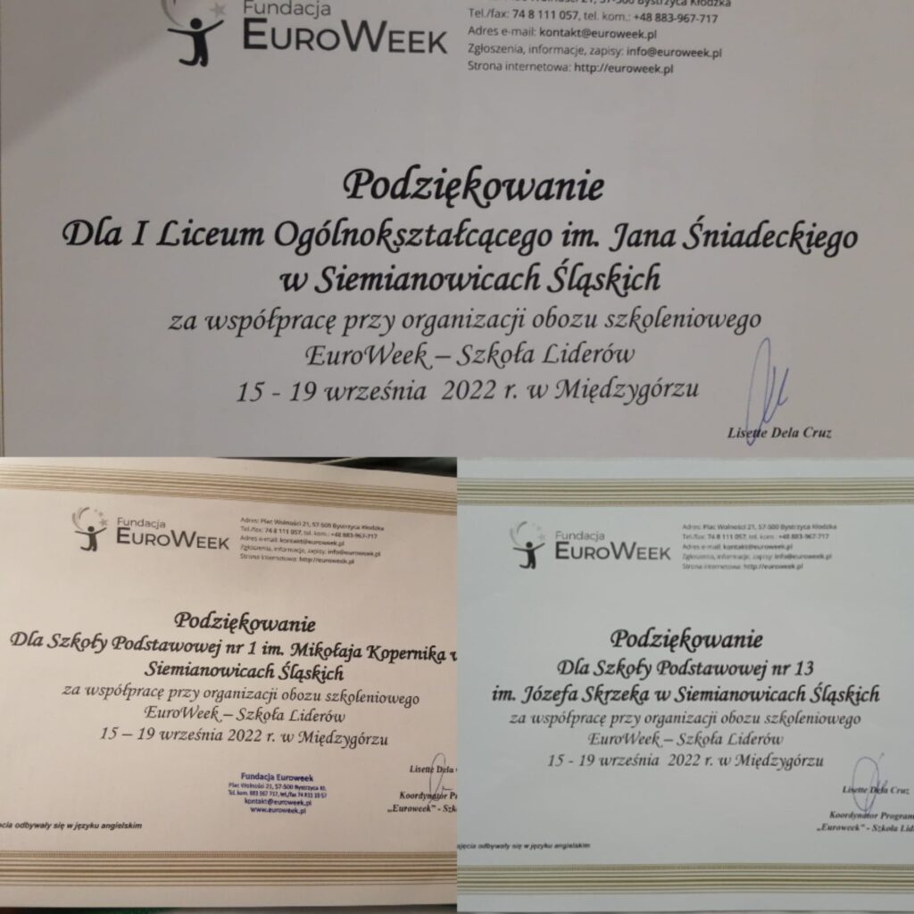 W dniach 15-19 września b.r uczniowie z zaprzyjaźnionych szkół: SP1, SP13 oraz I LO brali udział w obozie szkoleniowym „EuroWeek- Szkoła Liderów”. Podczas warsztatów mogli poszerzyć swoją wiedzę z zakresu języka angielskiego i pogłębić informację na temat kultury wielu krajów świata. Przez cztery dni uczestniczyliśmy w różnego rodzaju aktywnościach. Mogliśmy porozmawiać z wolontariuszami z Peru, Gruzji, Meksyku, Filipin, Włoch, Łotwy. Prezentowaliśmy tradycyjne tańce, uczyliśmy się podstawowych zwrotów w różnych językach, przygotowywaliśmy liczne scenki tematyczne i pokazy, między innymi siemianowickich talentów. Zastąpiliśmy szkolne lekcje maratonem atrakcji, spontaniczności, ciekawostek, niezapomnianych wrażeń, radości, a przede wszystkim ogromnej dawki żywego języka angielskiego. Wolontariusze opowiadali o swoich krajach, o ciekawostkach historycznych, geograficznych, kulturowych, specjałach kulinarnych. Bardzo chętnie integrowali się z naszymi uczniami, byli otwarci, życzliwi. Nasi uczniowie pokonywali swoje ograniczenia, bariery językowe i nieśmiałość. Z każdym dniem ich samoocena niesamowicie rosła.