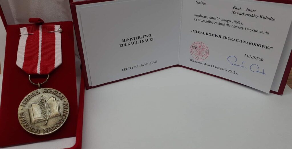 Pani Anna Nowatkowska – Waluga została uhonorowana najwyższym odznaczeniem oświatowym – Medalem Komisji Edukacji Narodowej; otrzymała go 16.11.2022 r. z rąk Śląskiej Kurator Oświaty Urszuli Bauer w Sali Marmurowej Śląskiego Urzędu Wojewódzkiego w Katowicach. Niewątpliwie były to dla Pani Anny wyjątkowe i uroczyste chwile. Droga do uzyskania tak wysokiego wyróżnienia jest niełatwa i najczęściej bardzo długa – wymaga wielu lat intensywnej i owocnej pracy