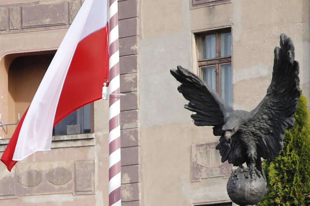 Orzeł wieńczący Pomnik Czynu Powstańczego. Obok biało-czerwona flaga