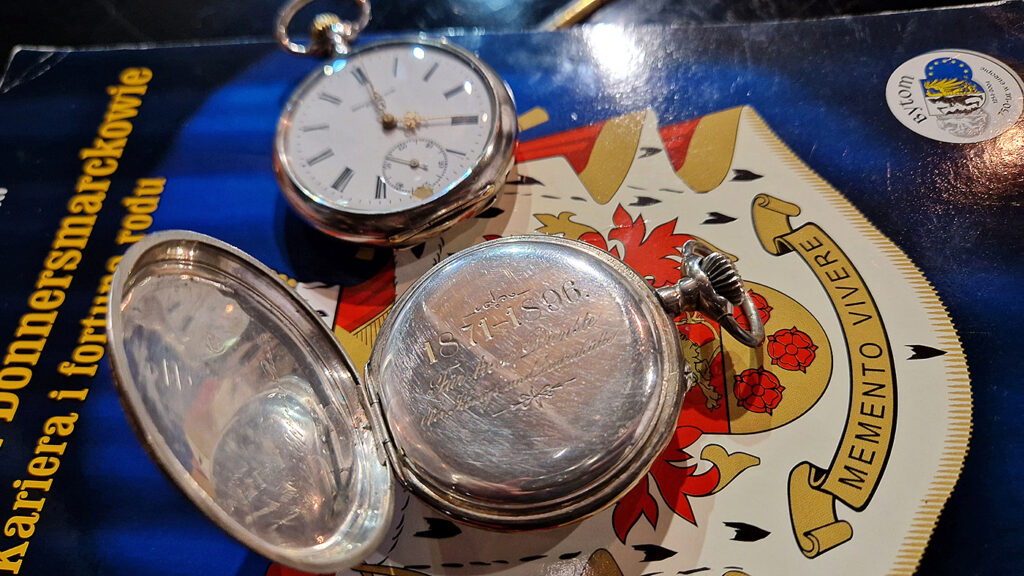 Pan Akradiusz zaprzyjaźnił się z siemianowickim seniorami podczas tegorocznych „Srebrnych wakacji” – cyklu wycieczek po siedzibach Donnersmarcków, w czasie których był bardzo zaangażowanym przewodnikiem. Przed wykładem jeden z gości pan Stanisław Stańczyk, pokazał dwa oryginalne pamiątkowe zegarki kieszonkowe. Zegarki były wręczane za ofiarną prace w zakładach Huty Laura. Zegarki są idealnym stanie i dalej działają!