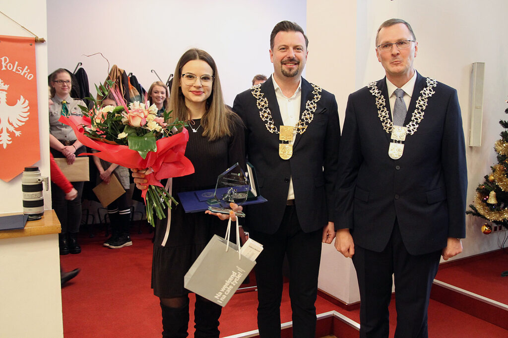 Uhonorowana siemianowicka zawodniczka karate Daria Dobkowska-Szefer, prezydent Rafał Piech i przewodniczący RM Adam Cebula.