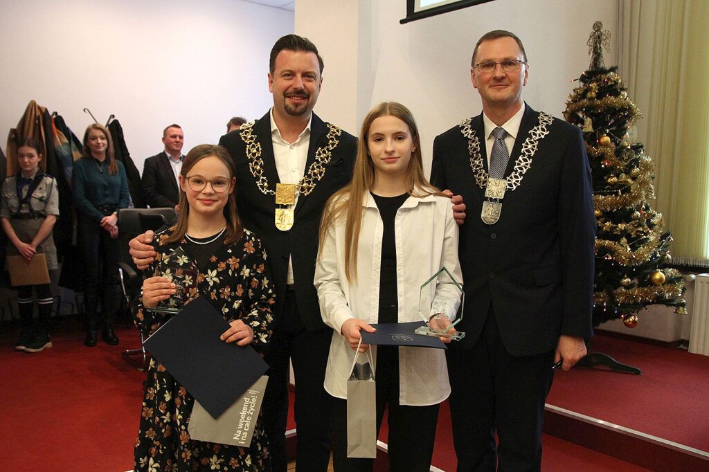 Prezydent Rafał Piech, przewodniczący Adam Cebula oraz dwie siemianowickie, utalentowane zawodniczki karate: Katarzyna Kasperska oraz Lena Kowalczuk.
