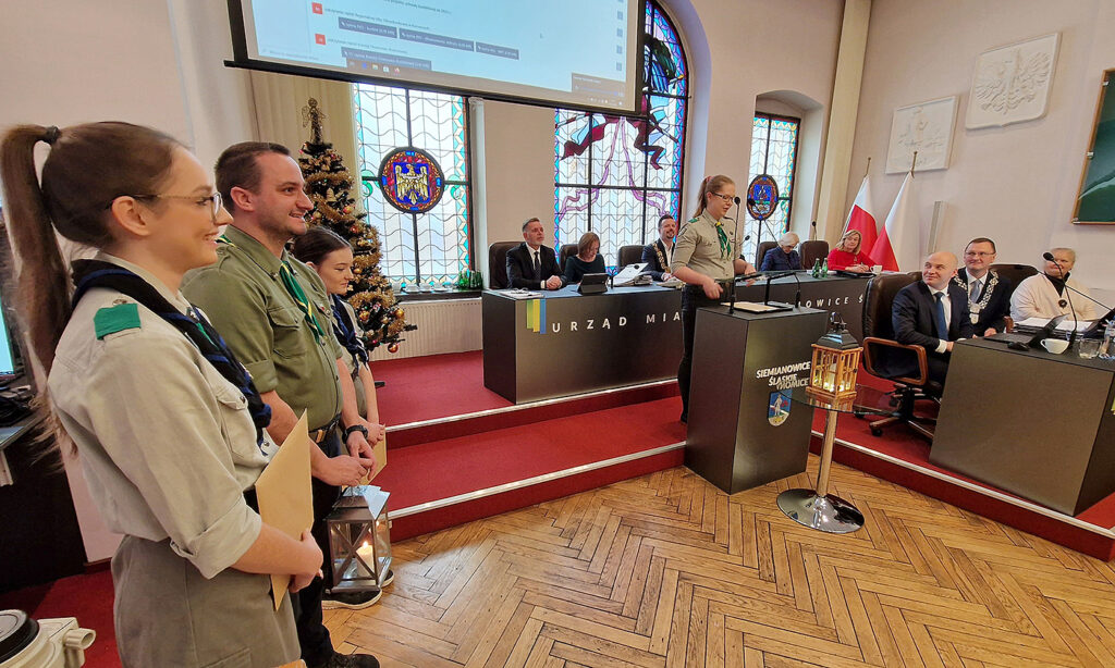 Siemianowiccy harcerze przekazują radnym Światełko Betlejemskie.