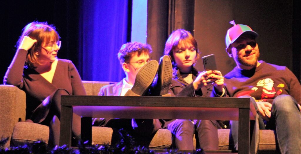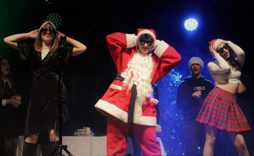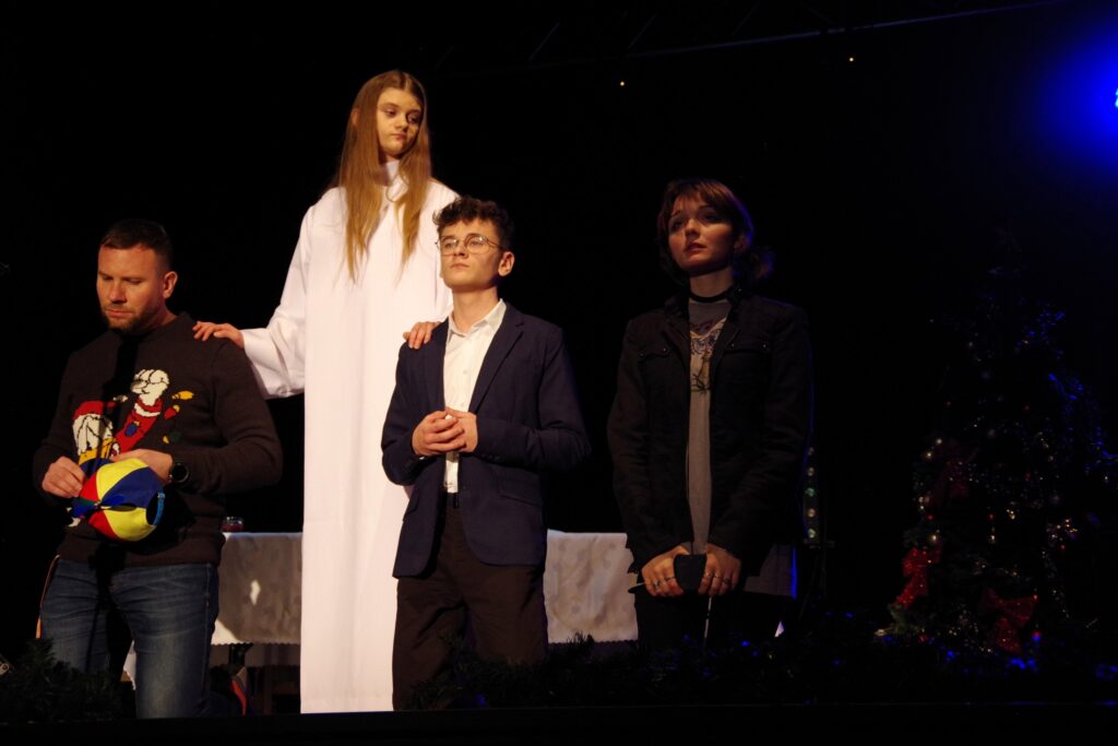 Trupa teatralna Szkolnego Koła Teologicznego pod opieką księdza Piotra i z jego udziałem pokazała szkolnej publiczności w sposób niezwykle przejmujący, czym tak naprawdę powinien być rodzinny czas świąteczny, portretując na scenie uniwersalną współczesną rodzinę. Było trochę gorzko, trochę prześmiewczo, wreszcie smutno i wzruszająco. Bo „Bóg w dom” czasem przychodzi wtedy, gdy jedni wpatrzeni w telefon, a inni w Kevina, nie potrafią dostrzec tej obecności…