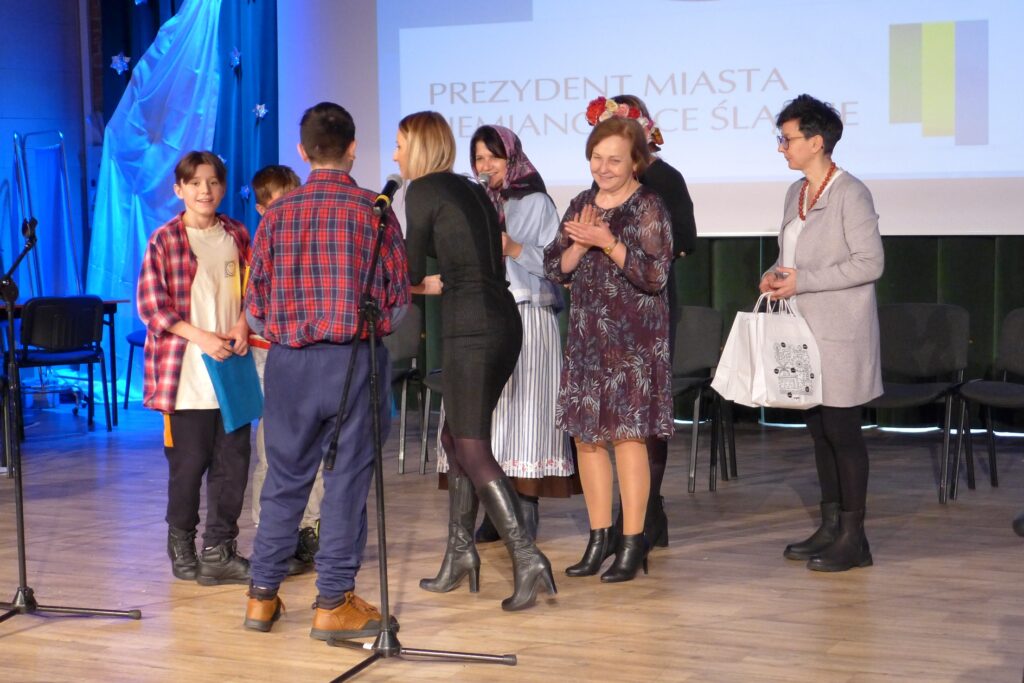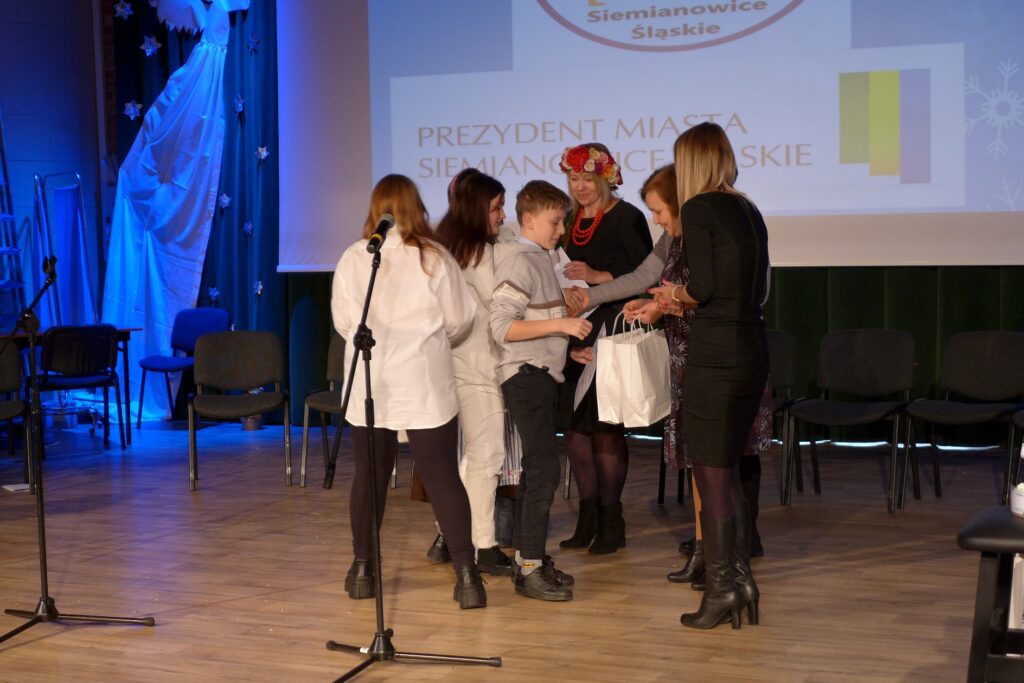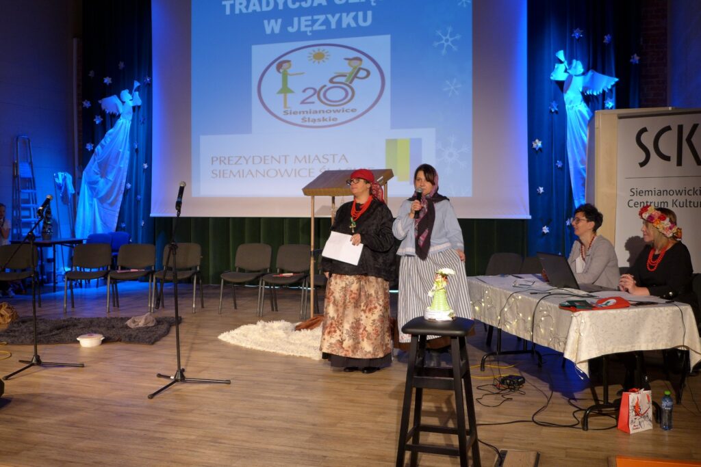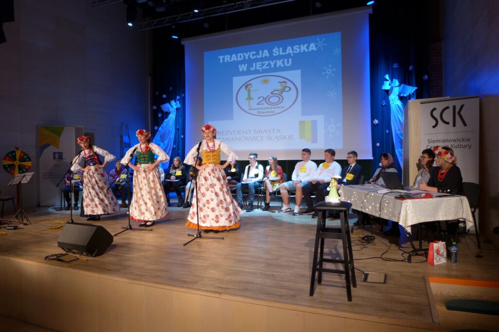 „TRADYCJA ŚLĄSKA W JĘZYKU” to nie tylko konkurs, lecz również szereg programów artystycznych, tematycznie zeń związanych. Tym razem w wyjątkowy, magiczny nastrój Bożego Narodzenia na Górnym Śląsku wprowadziły nas ujmujące za serce kolędy i pastorałki w wykonaniu uczniów Szkoły Podstawowej nr 20 z Od-działami Integracyjnymi pod koordynacją p. Beaty Szewczyk i śląskie jasełka w reżyserii p. Sylwii Kapałki. Kolorytu imprezie dodał występ wokalny Alicji i Katarzyny Donaj oraz Kaliny Bodzek – członkiń Zespołu Pieśni i Tańca „Siemianowice”. Ponadto mieliśmy okazję poznać szczegóły dotyczące tradycyjnego stroju śląskiego dzięki profesjonalnej prezentacji w wykonaniu garderobianej SCK-u – p. Wandy Bujoczek (wśród modeli podziwialiśmy: p. Katarzynę Bednarek, p. Marka Segeta i Kalinę Bodzek). W rolę charyzmatycznej konferansjerki wcieliła się p. Anna Bula. O scenografię zadbały: p. Izabela Janowska-Jelito i p. Beata Szewczyk. Profesjonalną oprawą fotoreporterską zajęła się Anna Babij. Nad całością przedsięwzięcia czuwała Dyrektor SP20 – p. Anna Nowara.