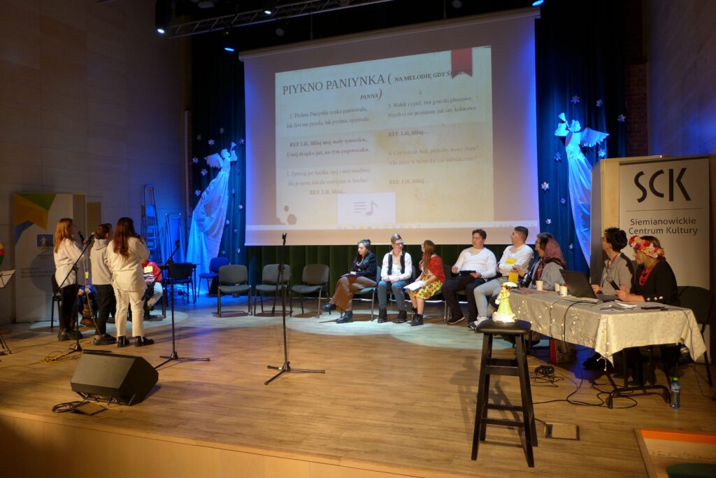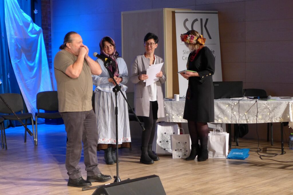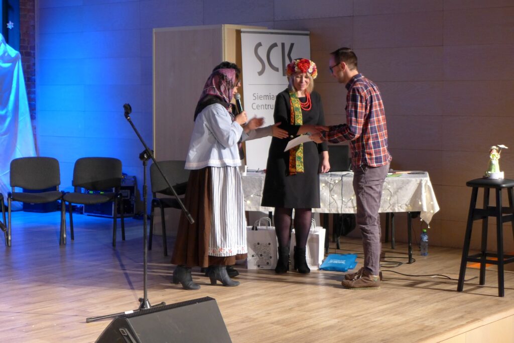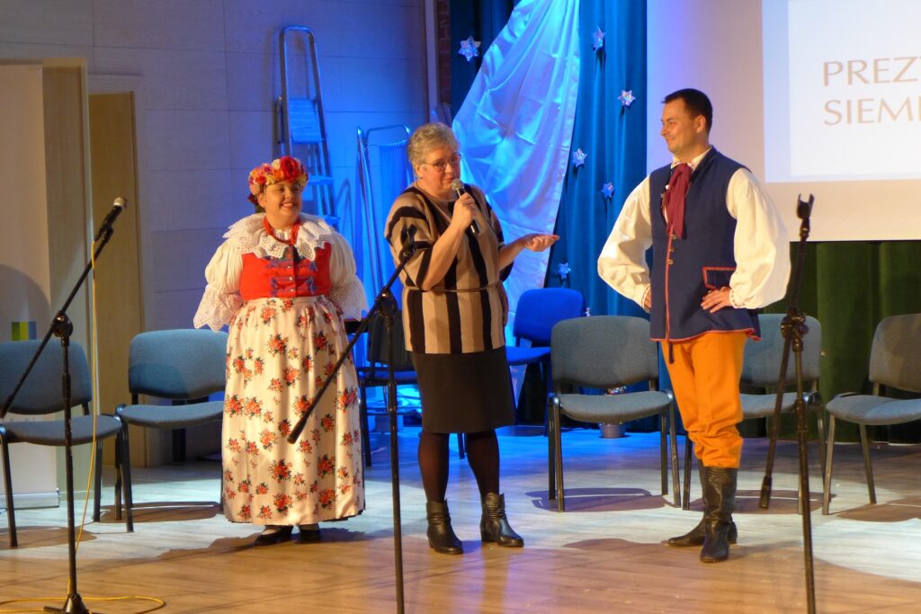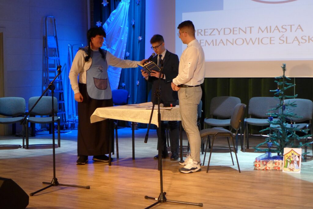 „TRADYCJA ŚLĄSKA W JĘZYKU” to nie tylko konkurs, lecz również szereg programów artystycznych, tematycznie zeń związanych. Tym razem w wyjątkowy, magiczny nastrój Bożego Narodzenia na Górnym Śląsku wprowadziły nas ujmujące za serce kolędy i pastorałki w wykonaniu uczniów Szkoły Podstawowej nr 20 z Od-działami Integracyjnymi pod koordynacją p. Beaty Szewczyk i śląskie jasełka w reżyserii p. Sylwii Kapałki. Kolorytu imprezie dodał występ wokalny Alicji i Katarzyny Donaj oraz Kaliny Bodzek – członkiń Zespołu Pieśni i Tańca „Siemianowice”. Ponadto mieliśmy okazję poznać szczegóły dotyczące tradycyjnego stroju śląskiego dzięki profesjonalnej prezentacji w wykonaniu garderobianej SCK-u – p. Wandy Bujoczek (wśród modeli podziwialiśmy: p. Katarzynę Bednarek, p. Marka Segeta i Kalinę Bodzek). W rolę charyzmatycznej konferansjerki wcieliła się p. Anna Bula. O scenografię zadbały: p. Izabela Janowska-Jelito i p. Beata Szewczyk. Profesjonalną oprawą fotoreporterską zajęła się Anna Babij. Nad całością przedsięwzięcia czuwała Dyrektor SP20 – p. Anna Nowara.