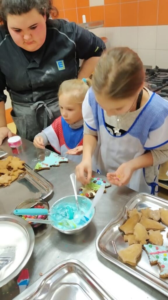 Kontynuując tradycję świątecznych Spotkań z Cogito po dwuletniej przerwie spowodowanej pandemią Covid gościliśmy w naszych progach podopiecznych ze Świetlic Wsparcia Dziennego dla dzieci w Siemianowicach Śląskich. W godzinach popołudniowych nauczyciele Bożena Trziszka oraz Helena Kruszecka wraz z młodzieżą z klasy trzeciej o profilu technik hotelarstwa i klasy 2 technik żywienia oraz klasy 2 o profilu cukiernik zaproponowali dzieciom przygodę