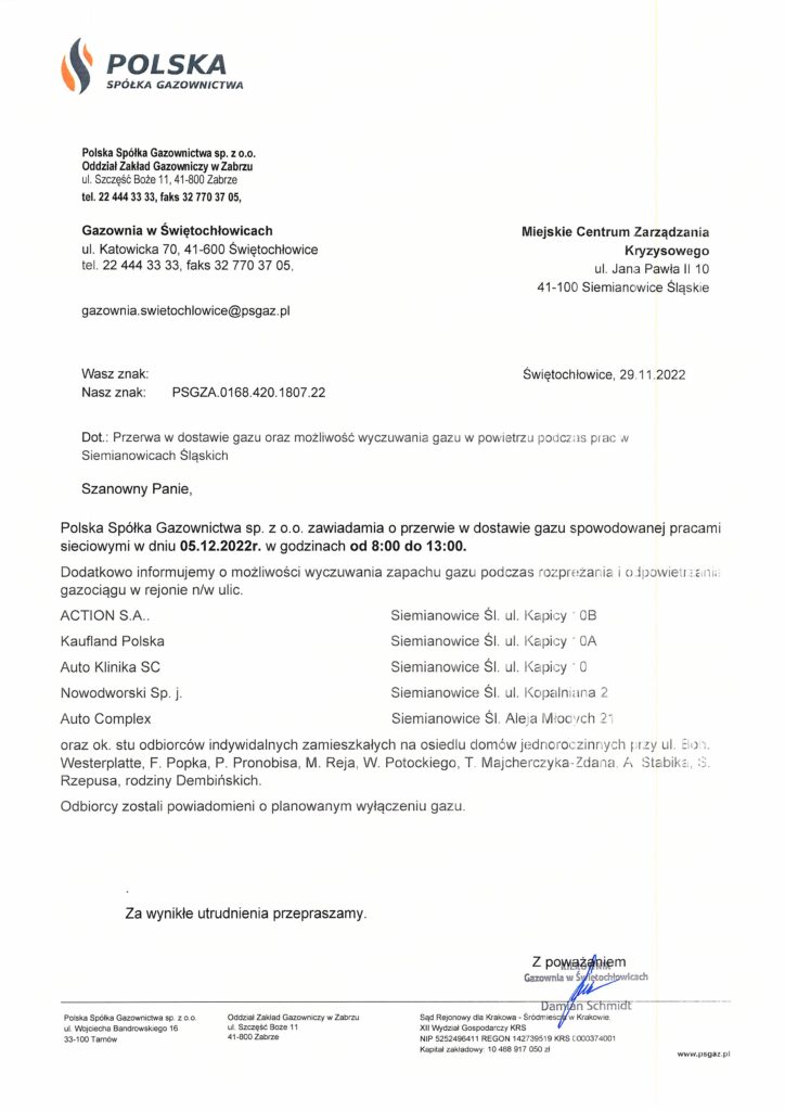 Miejskie Centrum Zarządzania Kryzysowego zawiadamia o możliwości pojawienia się zapachu gazu w najbliższy poniedziałek 5 grudnia. To efekt zaplanowanych prac na gazociągu.