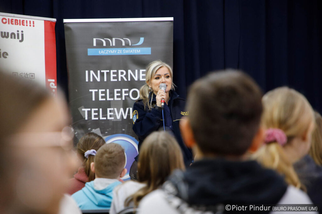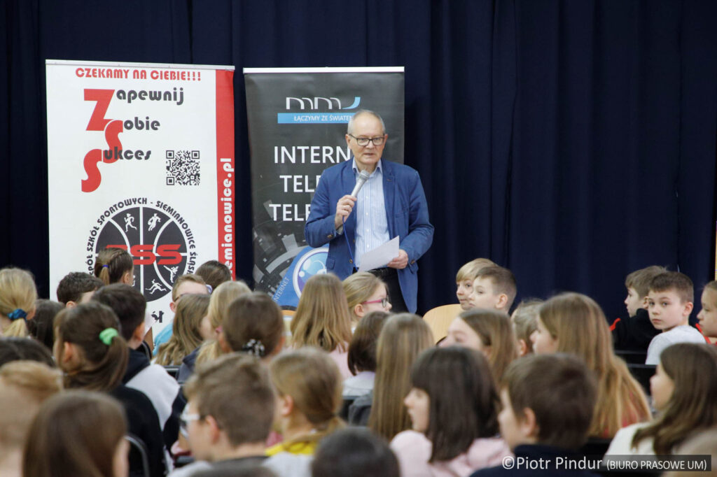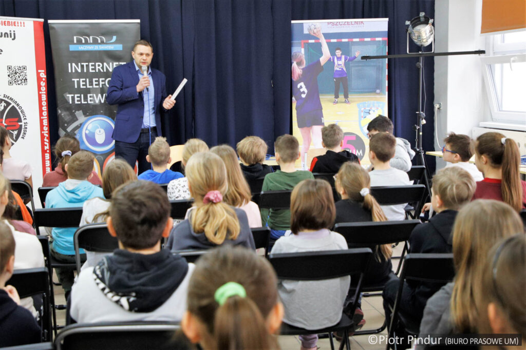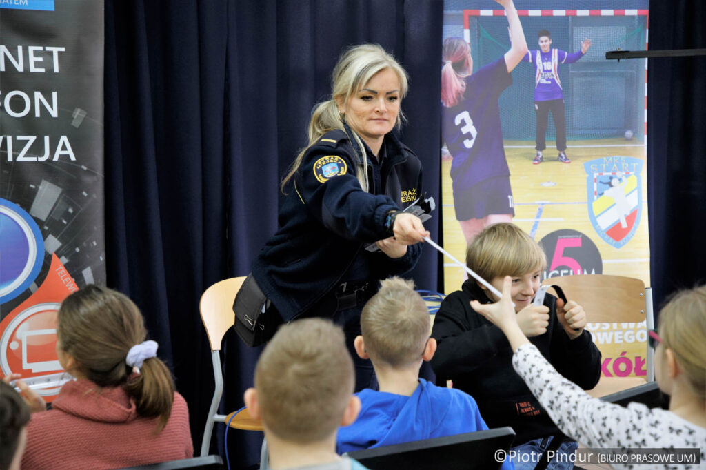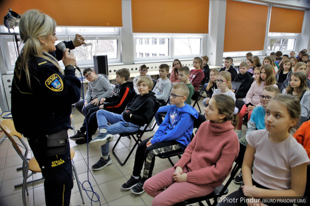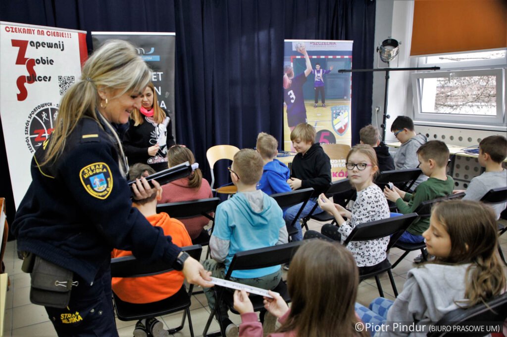W piątek, 17 lutego 2023 r., przedstawiciele Straży Miejskiej oraz firmy MMJ spotkali się w Zespole Szkół Sportowych przy ul. Mikołaja 3 w Siemianowicach z uczniami z klas IV-VIII. Ponieważ duża liczba uczniów tych klas uniemożliwiała zebranie się ich wszystkich w jednej sali, spotkanie odbyło się w trzech turach. W czasie każdej z nich funkcjonariuszka Straży Miejskiej przedstawiła tematy związane z bezpieczeństwem w ruchu drogowym i pieszym. Przedstawiła dzieciom zasady prawidłowego przechodzenia przez jezdnię (m.in. zasada lewo – prawo – lewo) i korzystania z przejść dla pieszych oraz zachęcała, by – zwłaszcza przy pogorszonej widoczności (np. wieczorem) – używać elementów odblaskowych, które sprawią, że staniemy się bardziej widoczni, a co za tym idzie – bezpieczniejsi.