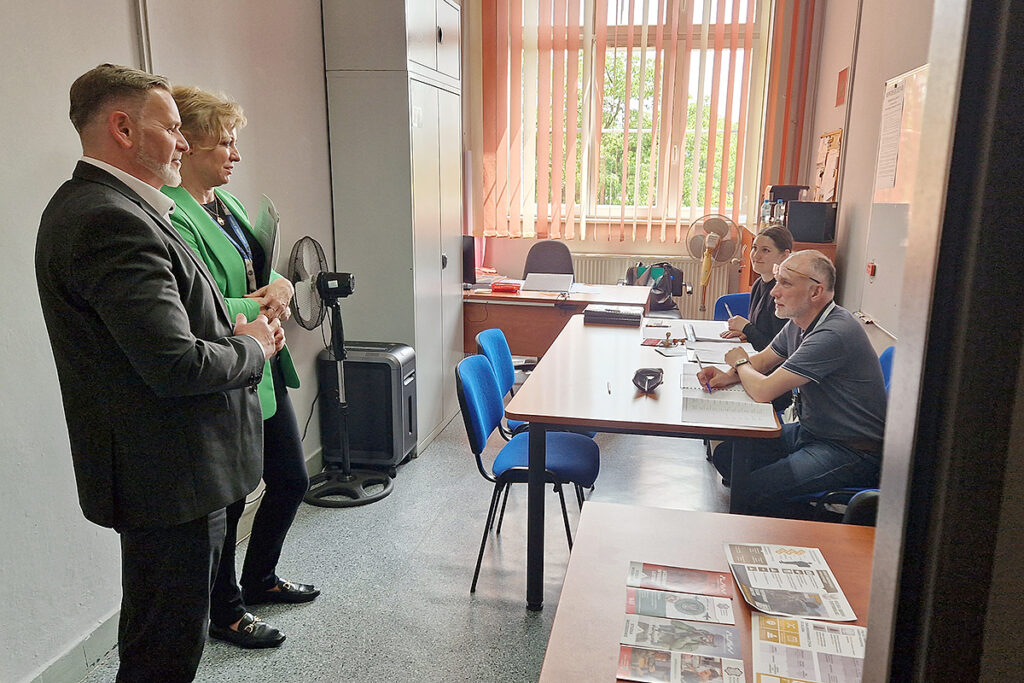 Adam Skowronek, Sekretarz Miasta i Izabela Pesel, Z-ca Naczelnika Wydziału Zarządzania Kryzysowego wymieniają uwagi z członkami komisji wojskowej.