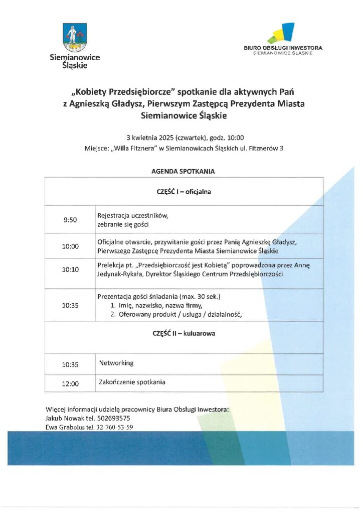 Agnieszka Gładysz, Pierwszy Zastępca Prezydenta Miasta Siemianowice Śląskie, serdecznie zaprasza wszystkie przedsiębiorcze kobiety na pierwsze w tym roku spotkanie networkingowe dedykowane kobietom w biznesie, które odbędzie się 3 kwietnia 2025 r. o godz. 10:00 w SCK Willa Fitznera przy ul. Fitznerów 3 w Siemianowicach Śląskich.