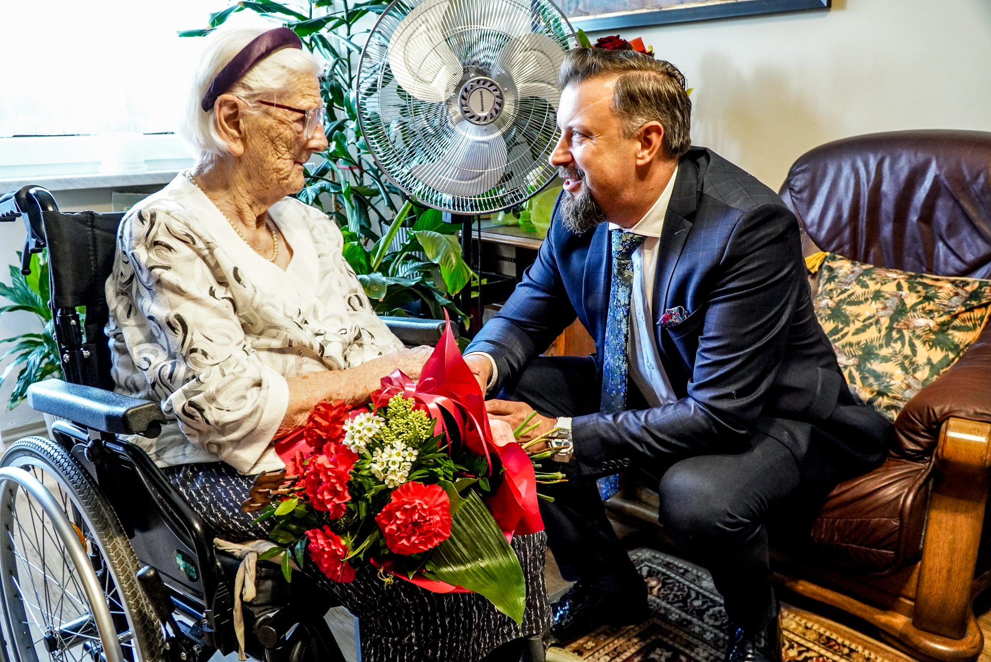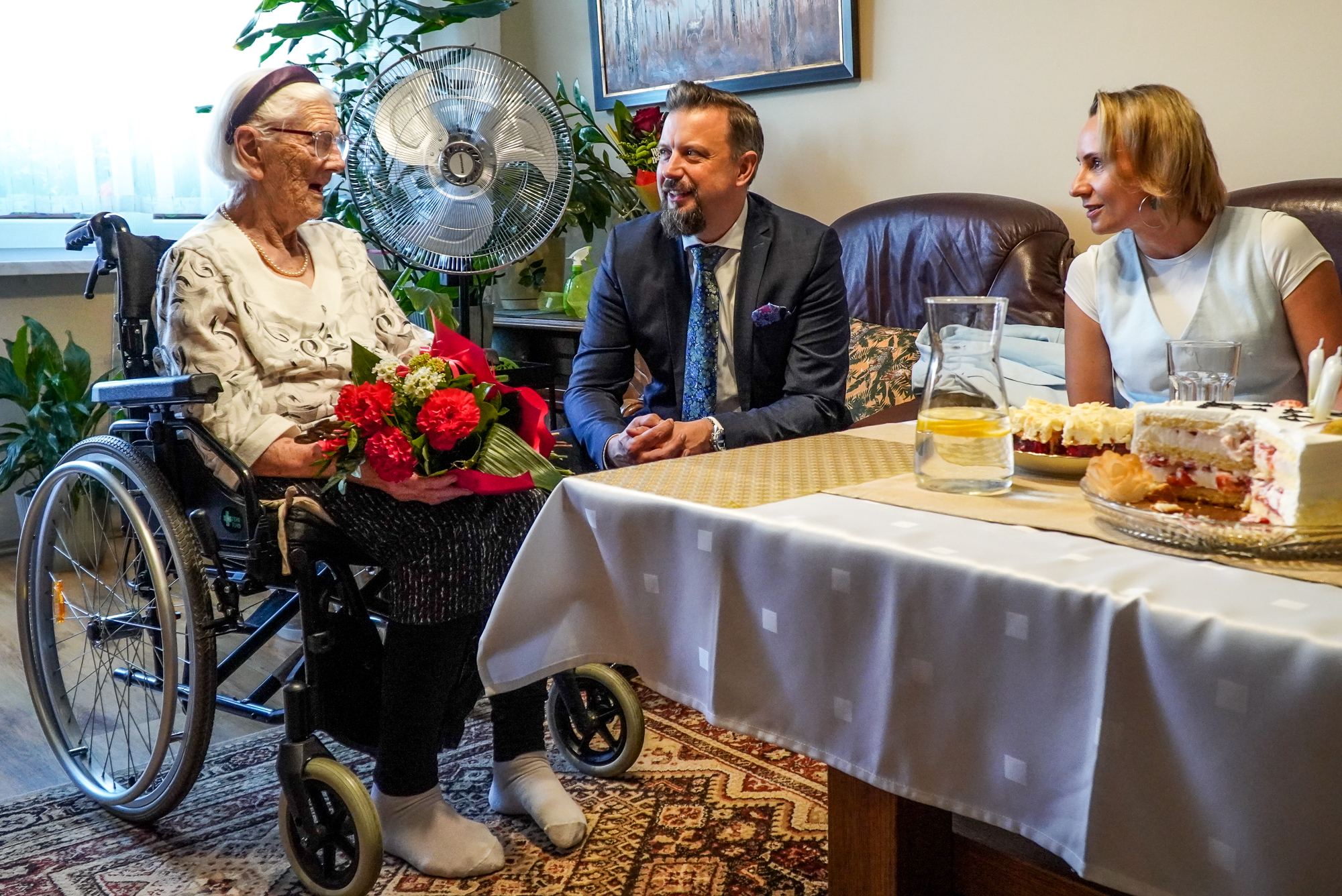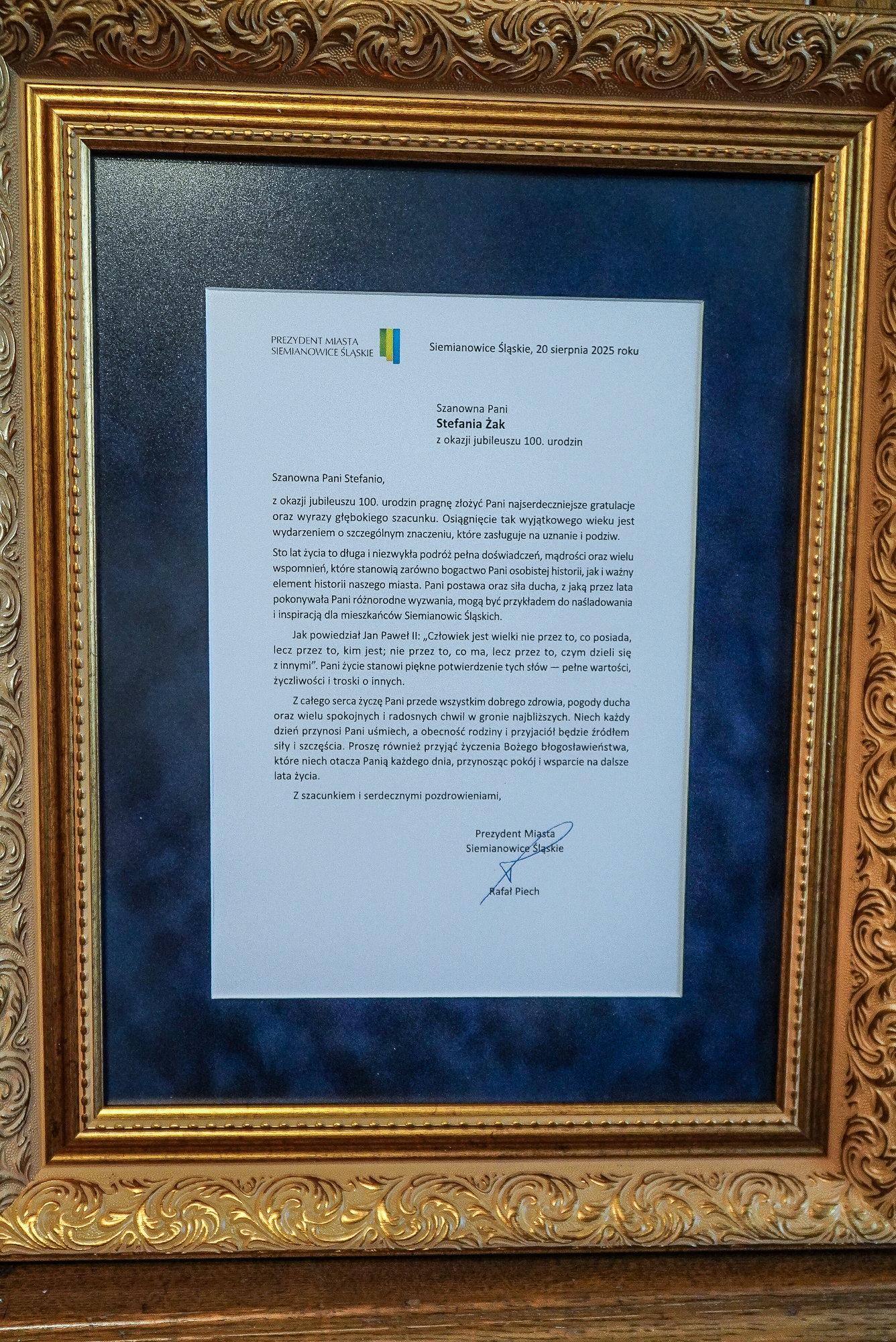 Z tej okazji dostojną Jubilatkę odwiedzili Rafał Piech – Prezydent Miasta Siemianowice Śląskie oraz Magdalena Mietła, Kierownik Urzędu Stanu Cywilnego. Pan Prezydent złożył pani Stefanii najserdeczniejsze życzenia zdrowia, Bożego błogosławieństwa, pogody ducha i kolejnych lat w otoczeniu miłości i szacunku najbliższych. Wręczył także bukiet kwiatów, list gratulacyjny w ozdobnej ramie oraz okolicznościowy upominek, podkreślając, że szczególną radością jest dla niego fakt, iż może gościć u Jubilatki dokładnie w dniu setnych urodzin.