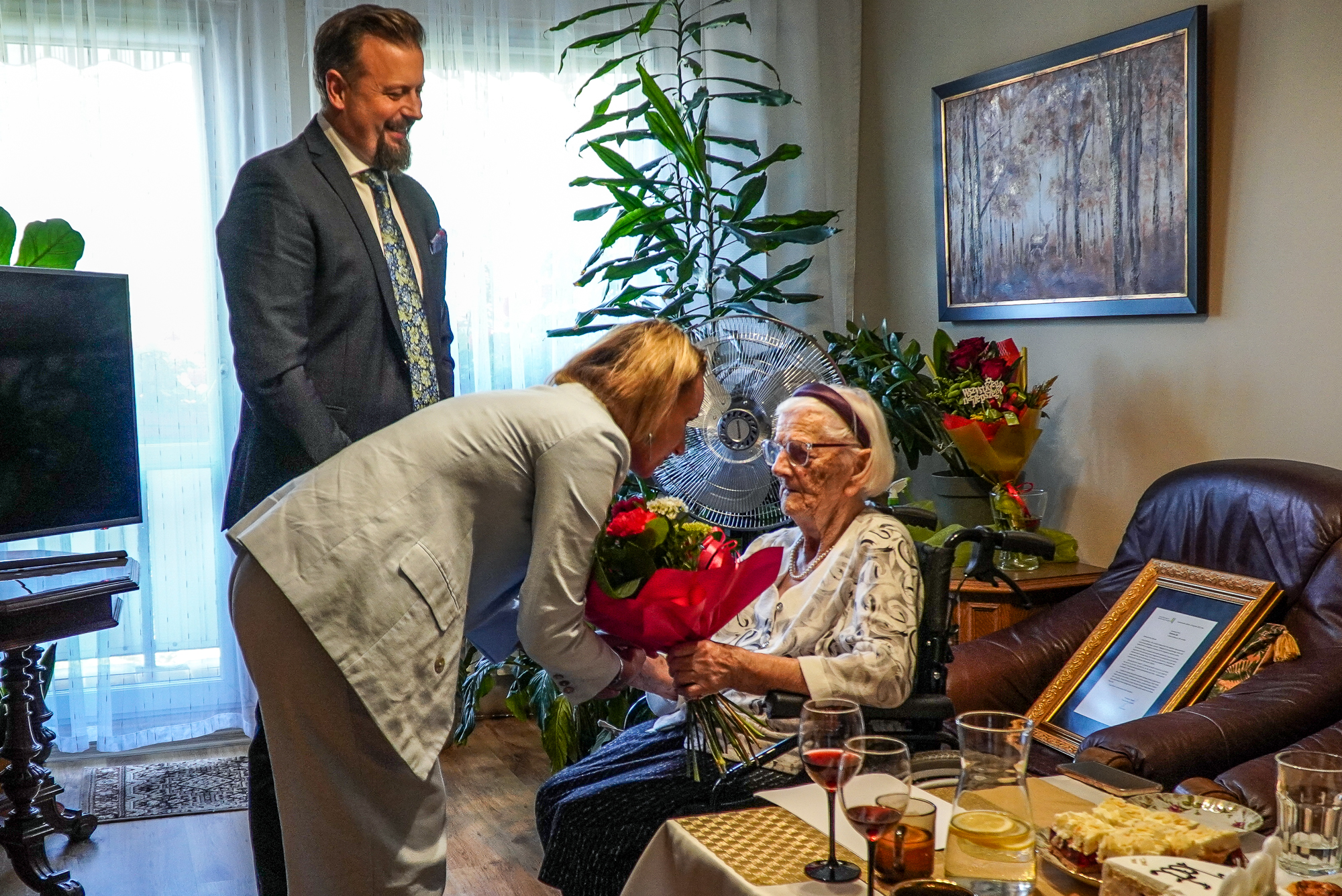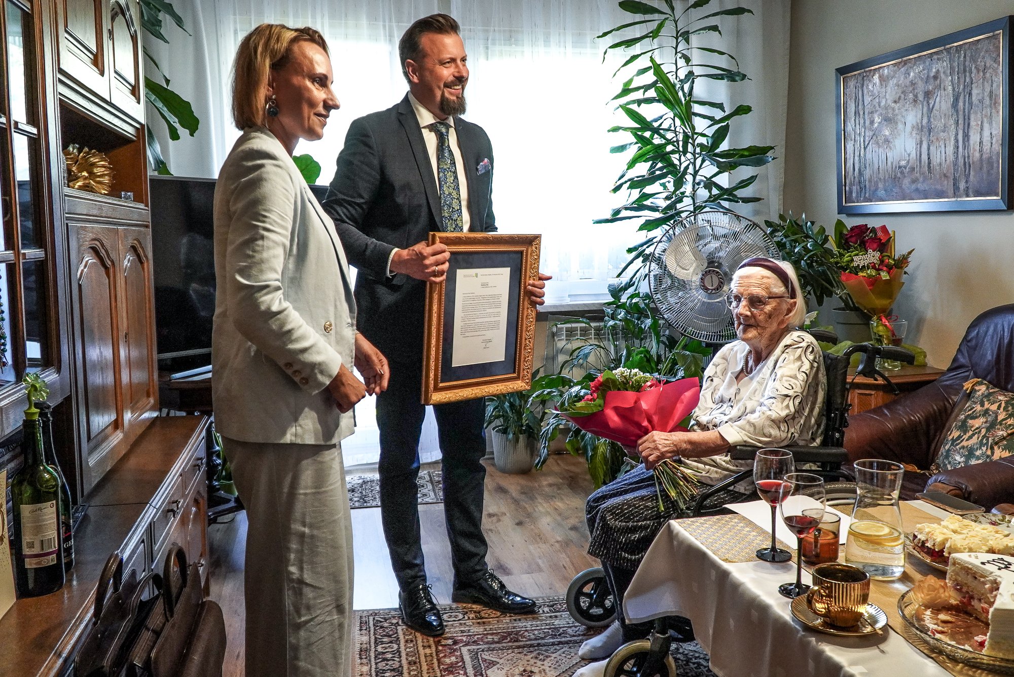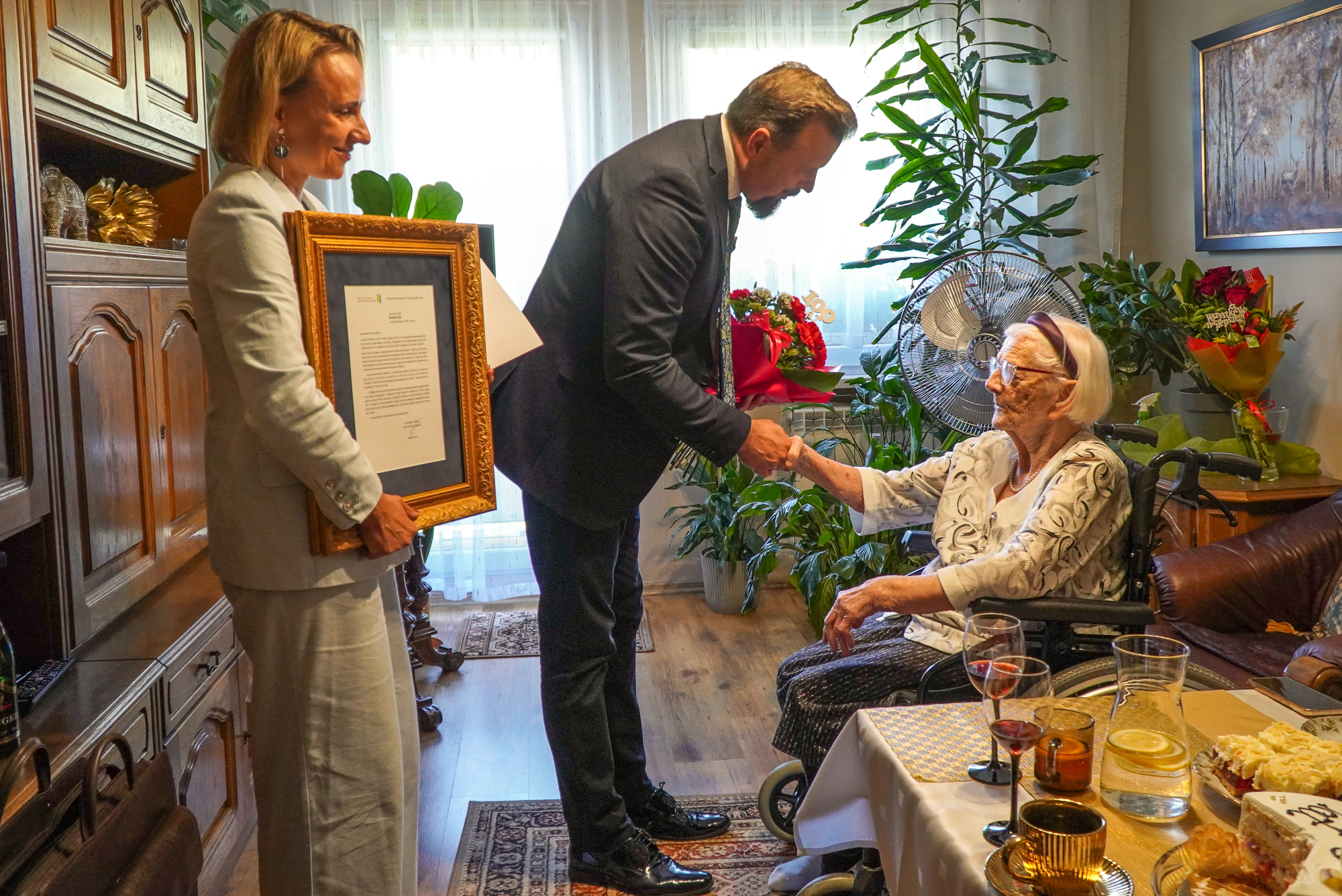Z tej okazji dostojną Jubilatkę odwiedzili Rafał Piech – Prezydent Miasta Siemianowice Śląskie oraz Magdalena Mietła, Kierownik Urzędu Stanu Cywilnego. Pan Prezydent złożył pani Stefanii najserdeczniejsze życzenia zdrowia, Bożego błogosławieństwa, pogody ducha i kolejnych lat w otoczeniu miłości i szacunku najbliższych. Wręczył także bukiet kwiatów, list gratulacyjny w ozdobnej ramie oraz okolicznościowy upominek, podkreślając, że szczególną radością jest dla niego fakt, iż może gościć u Jubilatki dokładnie w dniu setnych urodzin.