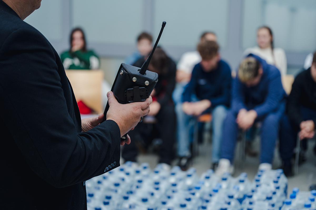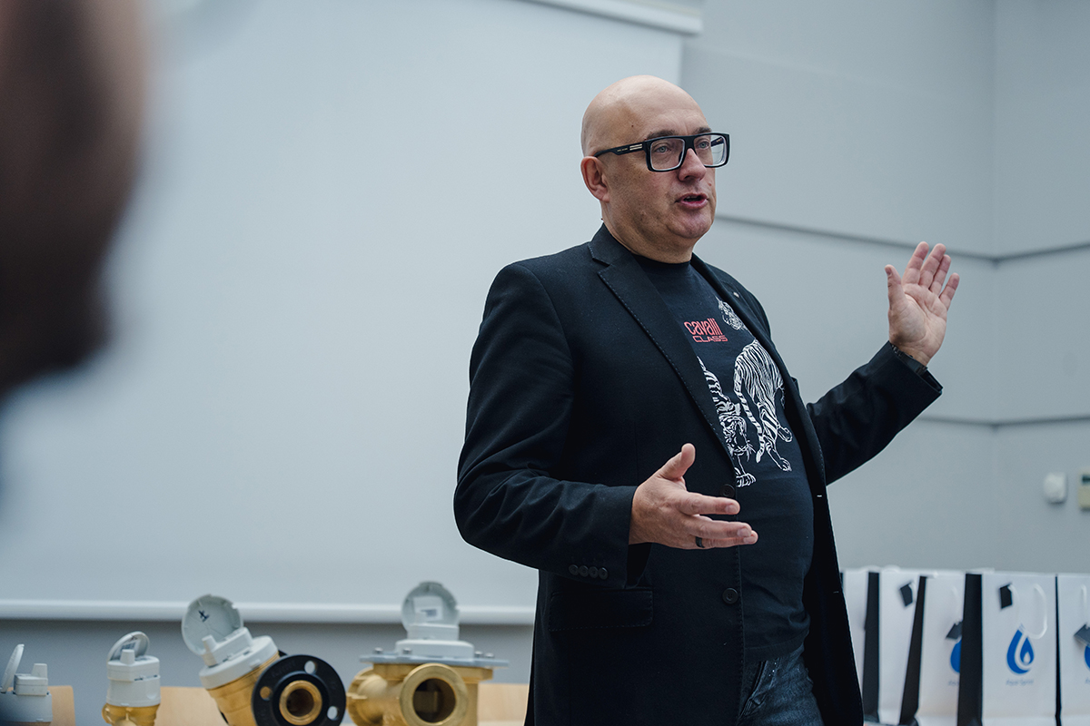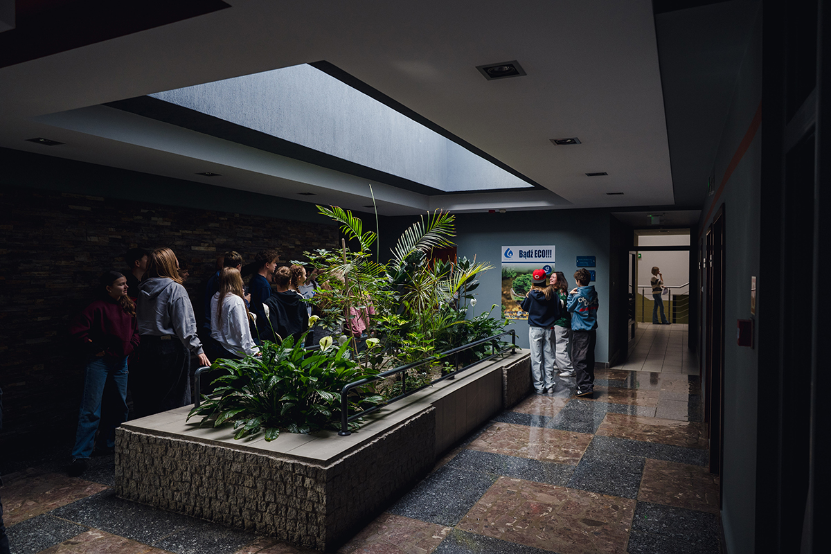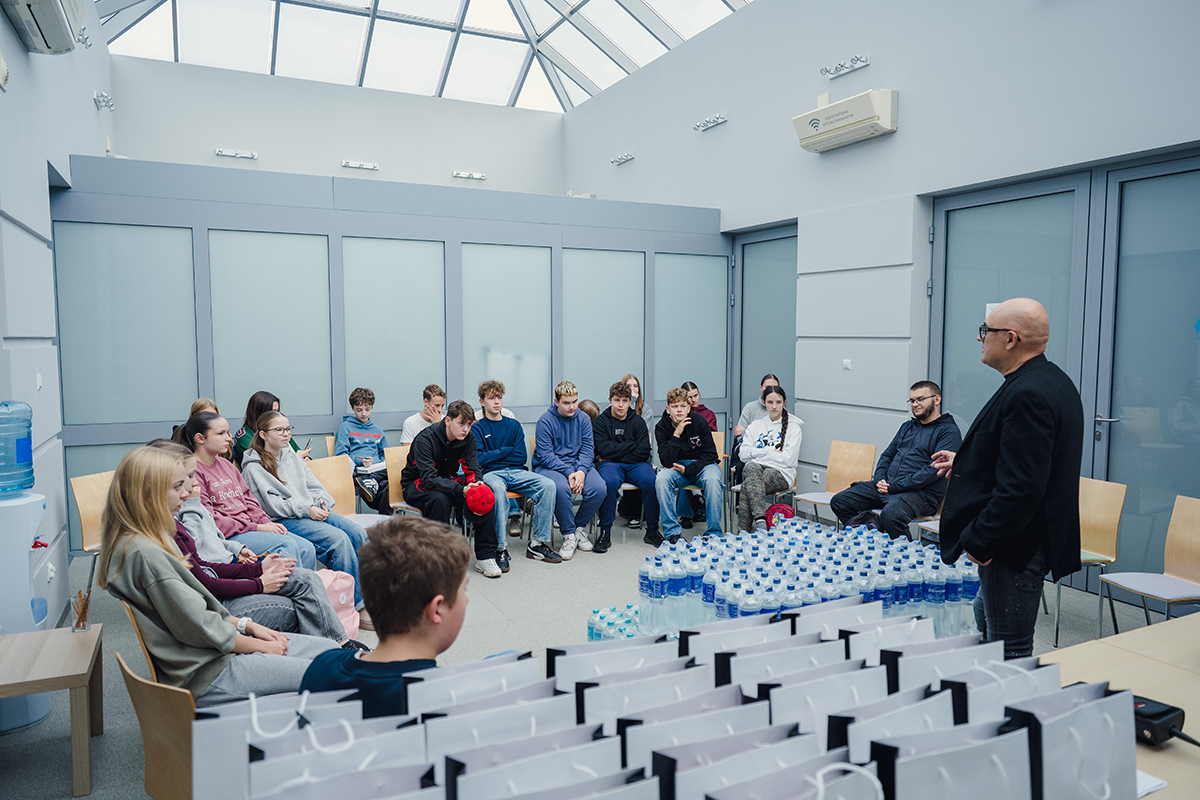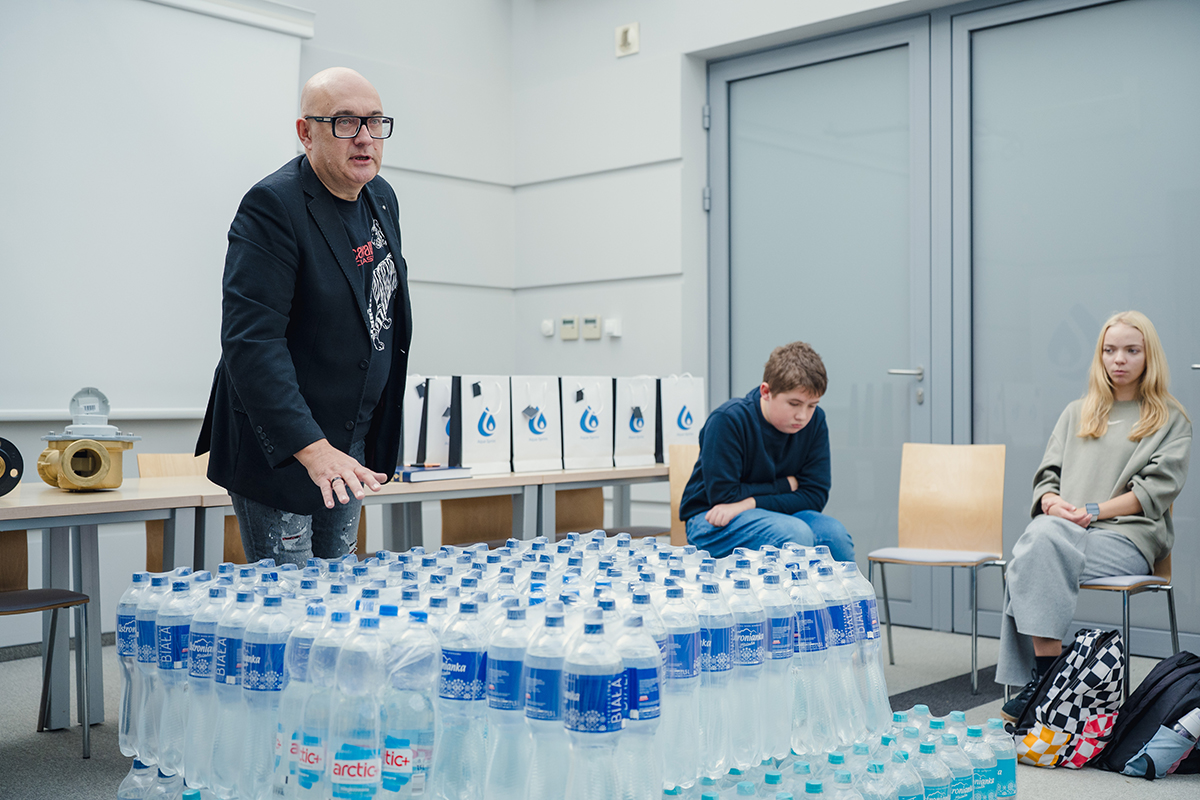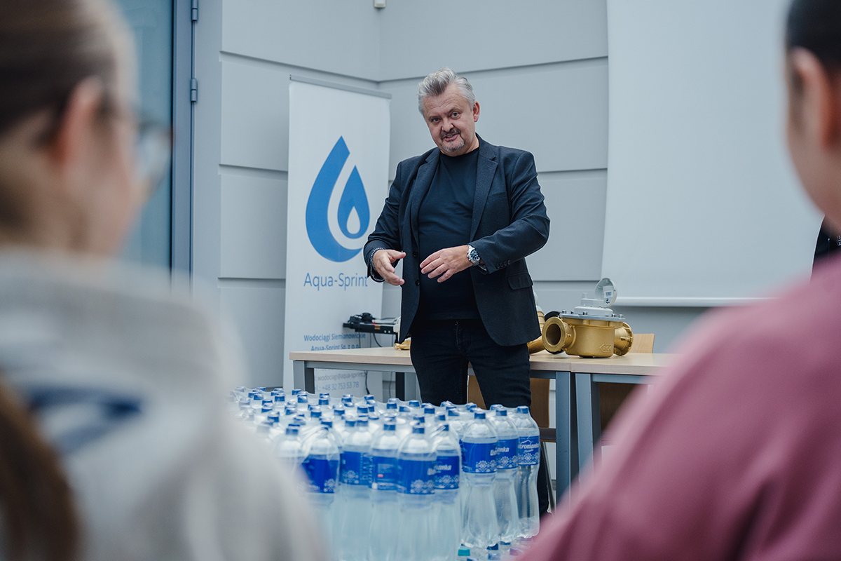 Spotkanie rozpoczął prezes zarządu Piotr Komraus, który przywitał młodzież oraz wprowadził uczestników w historię i działalność przedsiębiorstwa. Opowiedział o początkach firmy, jej rozwoju oraz znaczeniu dla mieszkańców Siemianowic Śląskich. Następnie głos zabrał Seweryn Świaczny, który w przystępny i ciekawy sposób przedstawił proces dostarczania wody do domów. Na przykładzie poukładanych zgrzewek wody wyjaśnił, czym jest metr sześcienny wody oraz jak wygląda jej droga przez sieć rur do naszych kranów.