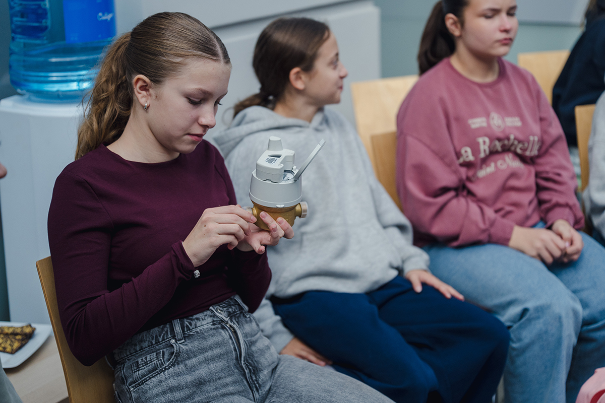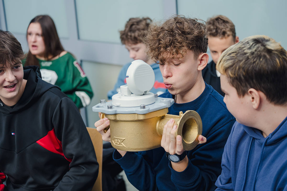 W dalszej części spotkania uczniowie poznali różne rodzaje wodomierzy, dzięki którym możliwy jest dokładny odczyt zużycia wody. Szczególne zainteresowanie młodzieży wzbudziły duże, precyzyjne urządzenia wykorzystywane przez firmę na co dzień. Pracownicy spółki zaprezentowali również nowoczesne urządzenie do zdalnego sczytywania danych, działające na zasadzie fal radiowych. Jak się okazało, pracownicy Wodociągów raz w miesiącu objeżdżają całe miasto z takim urządzeniem, odczytując dane o zużyciu wody z wielu tysięcy liczników.
