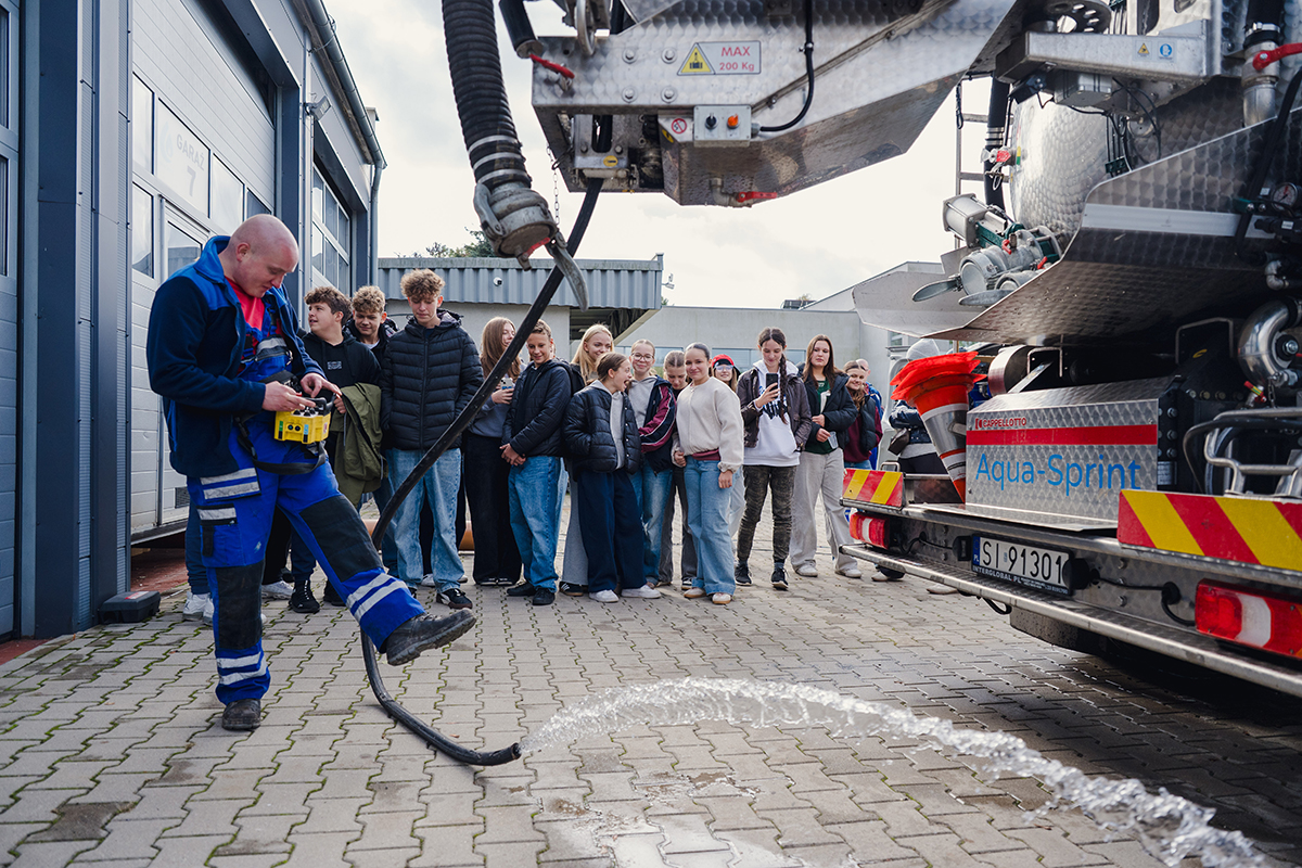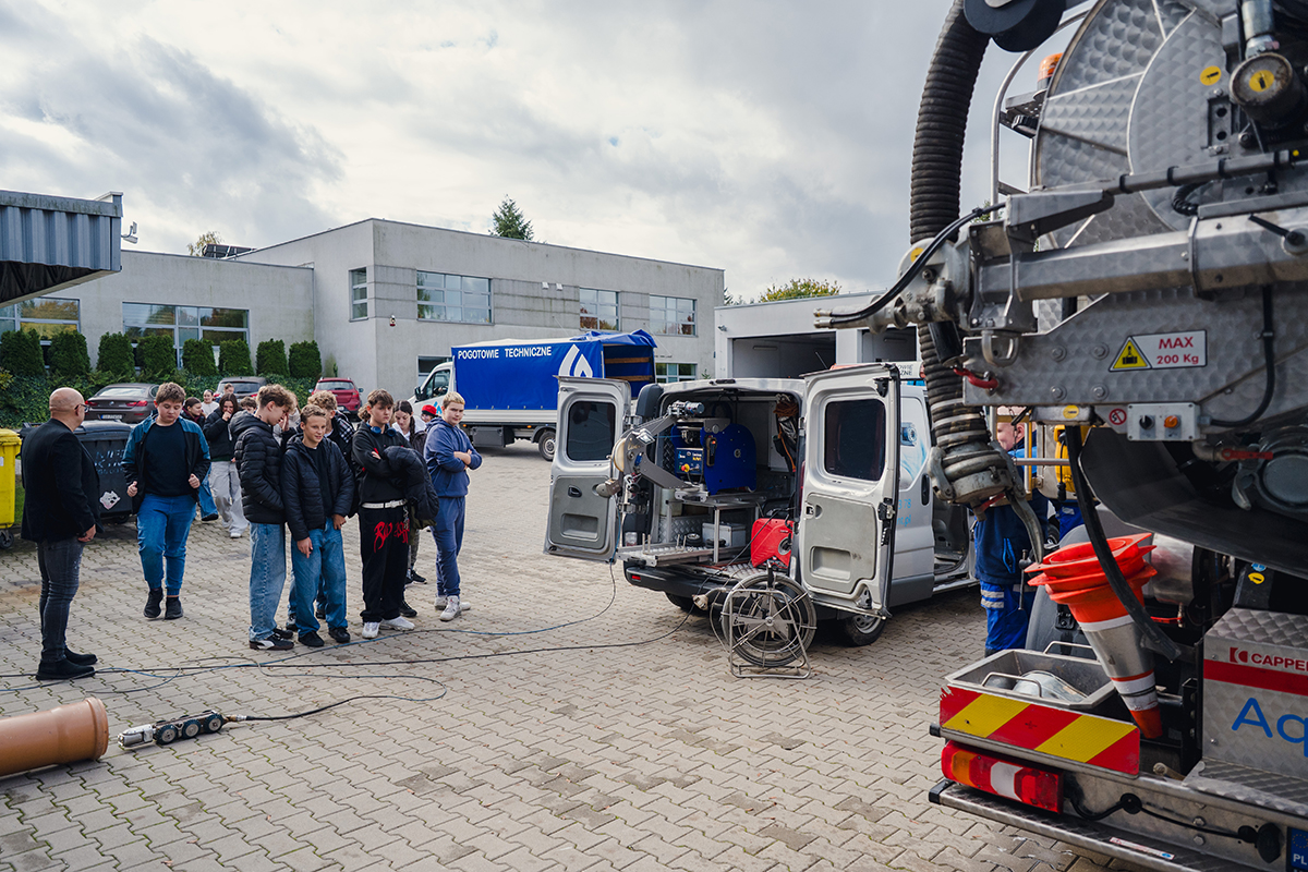 Nie zabrakło również praktycznych pokazów – doświadczeni pracownicy zaprezentowali robota służącego do udrażniania rur oraz wyposażenie pojazdu pogotowia technicznego. Uczniowie mieli okazję obejrzeć jego wnętrze i zrobić sobie pamiątkowe zdjęcia. Na zakończenie wizyty na uczestników czekały drobne upominki przygotowane przez firmę.