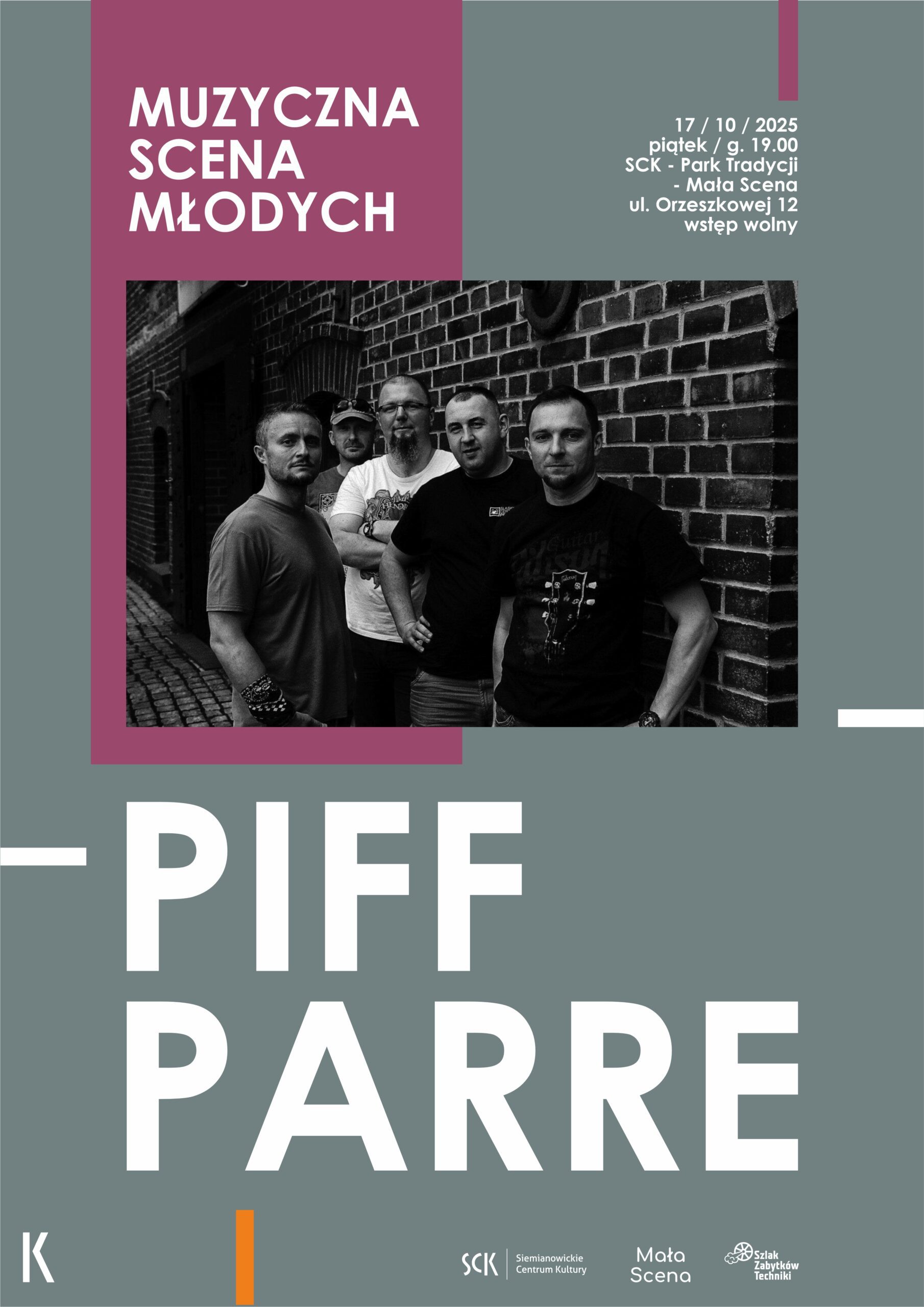 Okazji do odwiedzenia Małej Sceny w najbliższym czasie nie będzie brakowało. Już w najbliższy piątek godz. 19.00 w ramach cyklu Muzyczna Scena Młodych (wcześniej realizowanego w SCK – Jarzębina) zagra zespół Piff Parre, który w przeszłości swoim blues-rockowym brzmieniem nieraz porywał siemianowicką publiczność. Szczegóły w wydarzeniu na facebooku: https://fb.me/e/3Cf3xQWUf