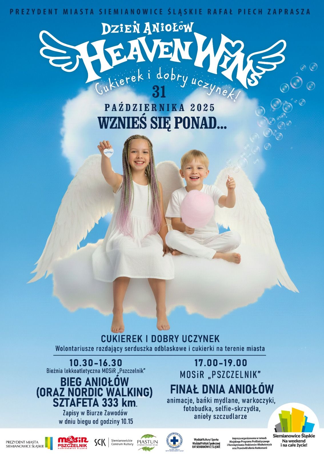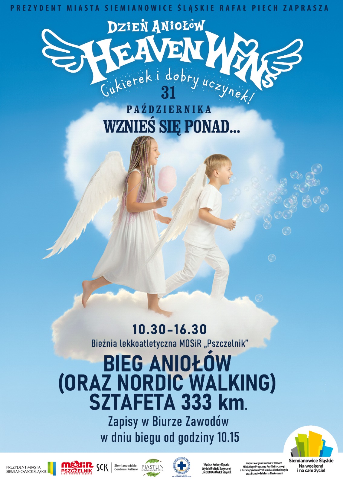 Wydział Kultury i Sportu Urzędu Miasta Siemianowice Śląskie oraz Miejski Ośrodek Sportu i Rekreacji „Pszczelnik” w Siemianowicach Śląskich zapraszają 31 października br. (piątek) na BIEG ANIOŁÓW (ORAZ NORDIC WALKING) – Sztafeta 333 km, w godz. 10.30-16.30 na bieżni lekkoatletycznej MOSiR „Pszczelnik”.