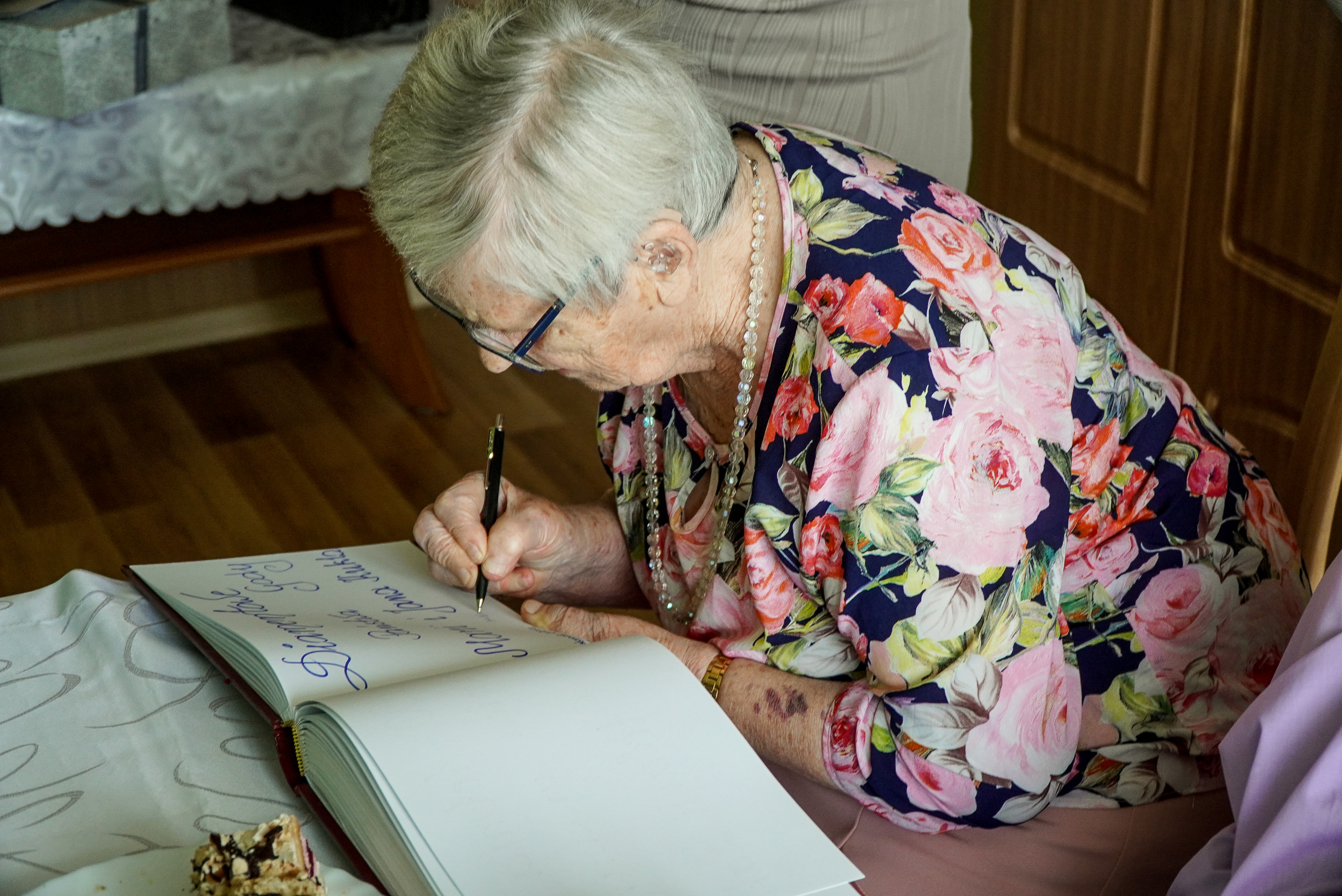 Na koniec wizyty, zgodnie z wieloletnią tradycją, Pani Maria w imieniu siebie i swojego męża dokonała pamiątkowego wpisu do kroniki Urzędu Stanu Cywilnego. To gest pełen znaczenia – zapisanie chwili dla kolejnych pokoleń, przekazanie świadectwa o miłości, która trwała sześć dekad i trwa nadal.