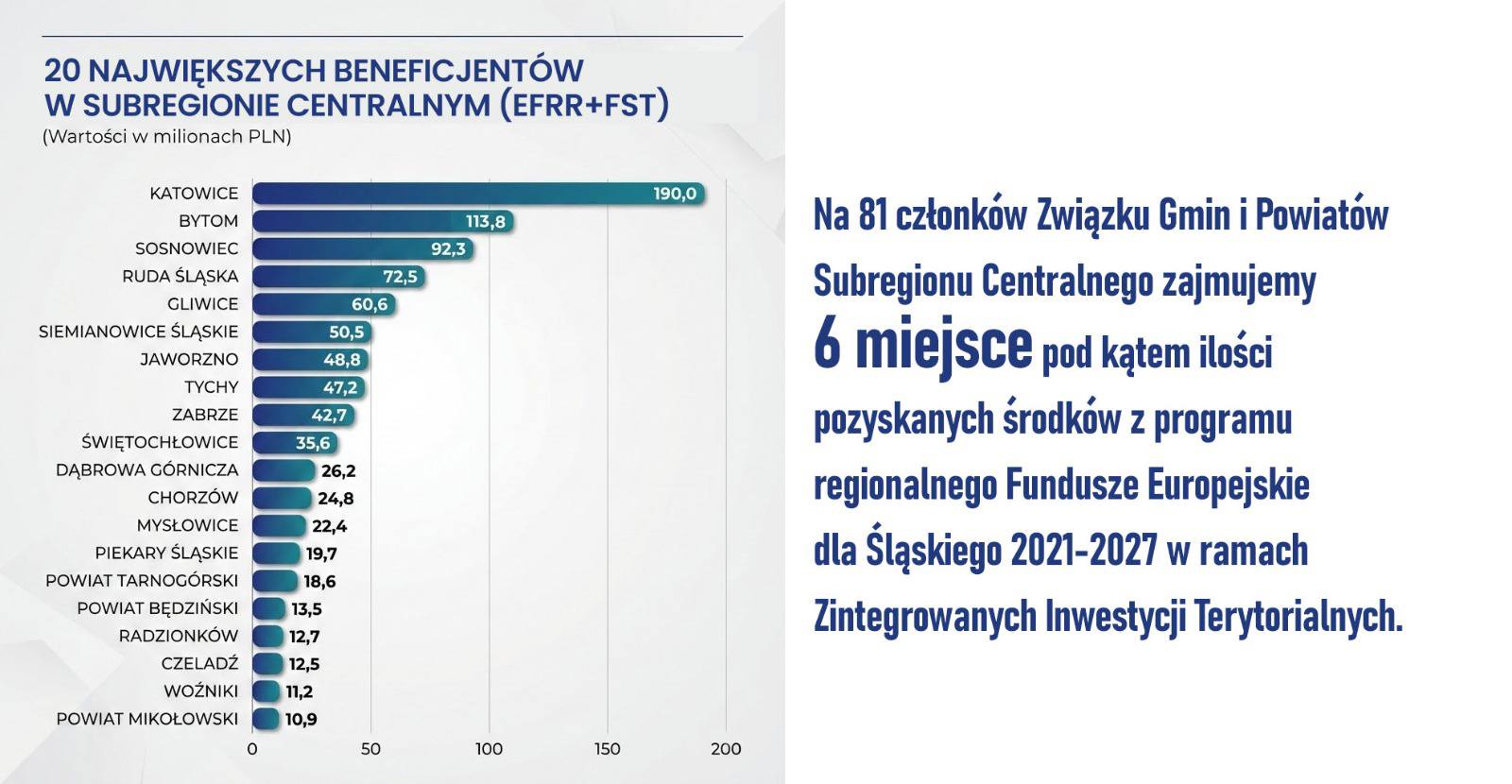 To właśnie w obszarze ZIT Siemianowice Śląskie osiągają bardzo wysokie pozycje w zestawieniach regionalnych. Na 81 członków Związku Gmin i Powiatów Subregionu Centralnego nasze miasto zajmuje 6 miejsce pod kątem liczby pozyskanych środków z programu regionalnego Fundusze Europejskie dla Śląskiego 2021-2027. Z kolei w samym podregionie katowickim uplasowało się na 3 miejscu, tuż za Katowicami i Rudą Śląską.