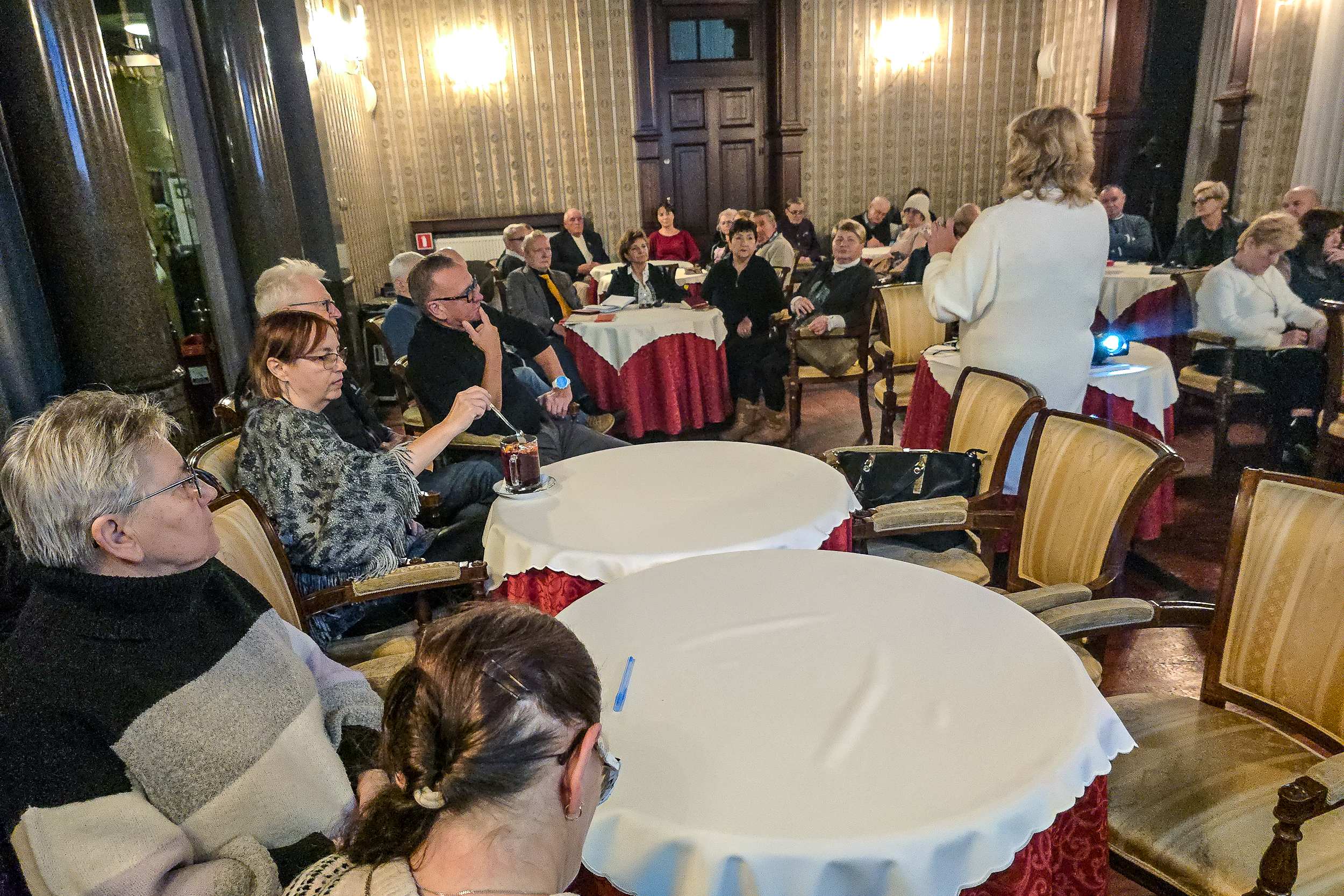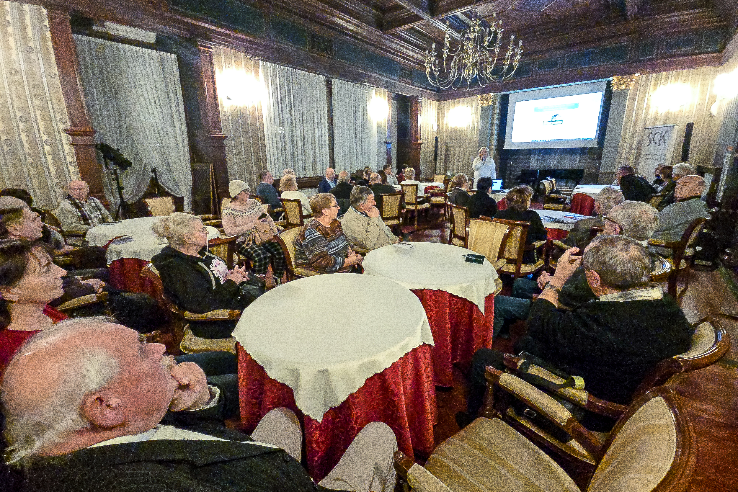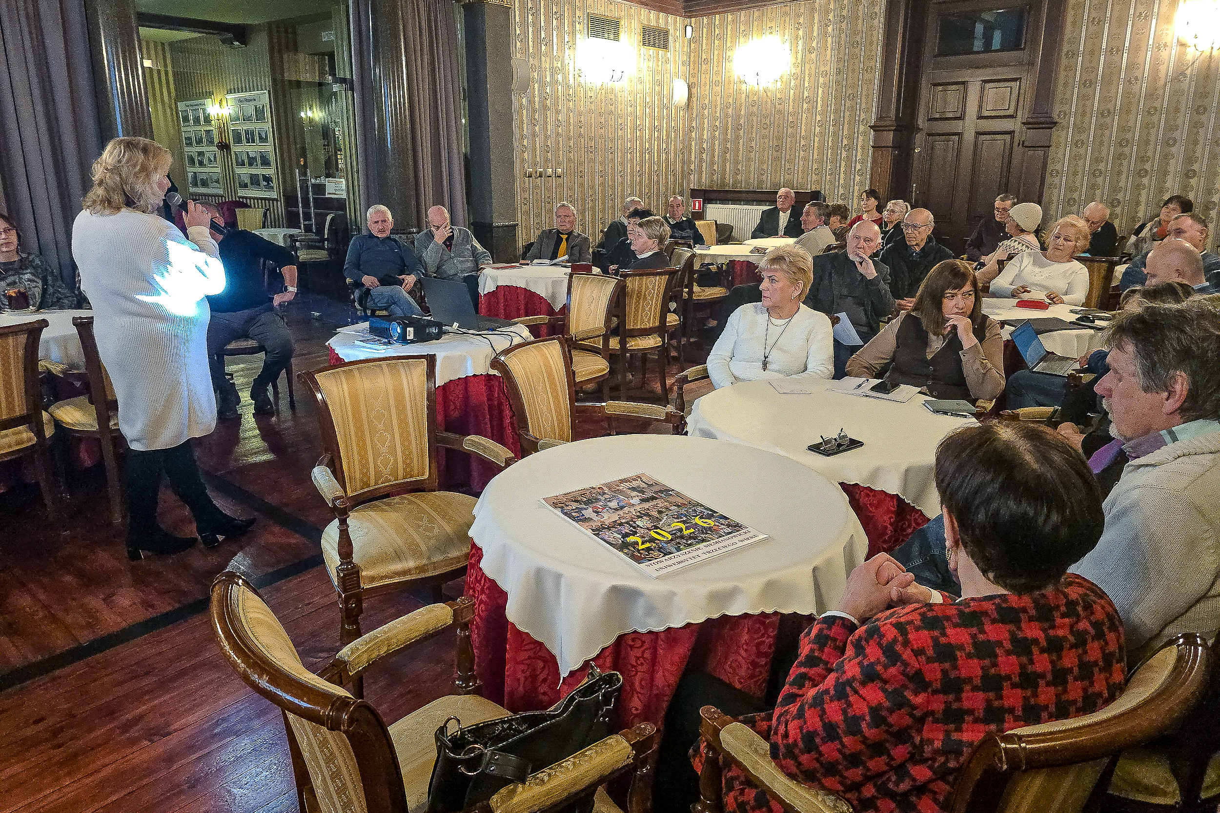 Szeroki plan sali w SCK Willa Fitznera z seniorami zajmującymi miejsca przy stolikach i prowadzącą prezentującą informacje o naborze do Rady Seniorów.