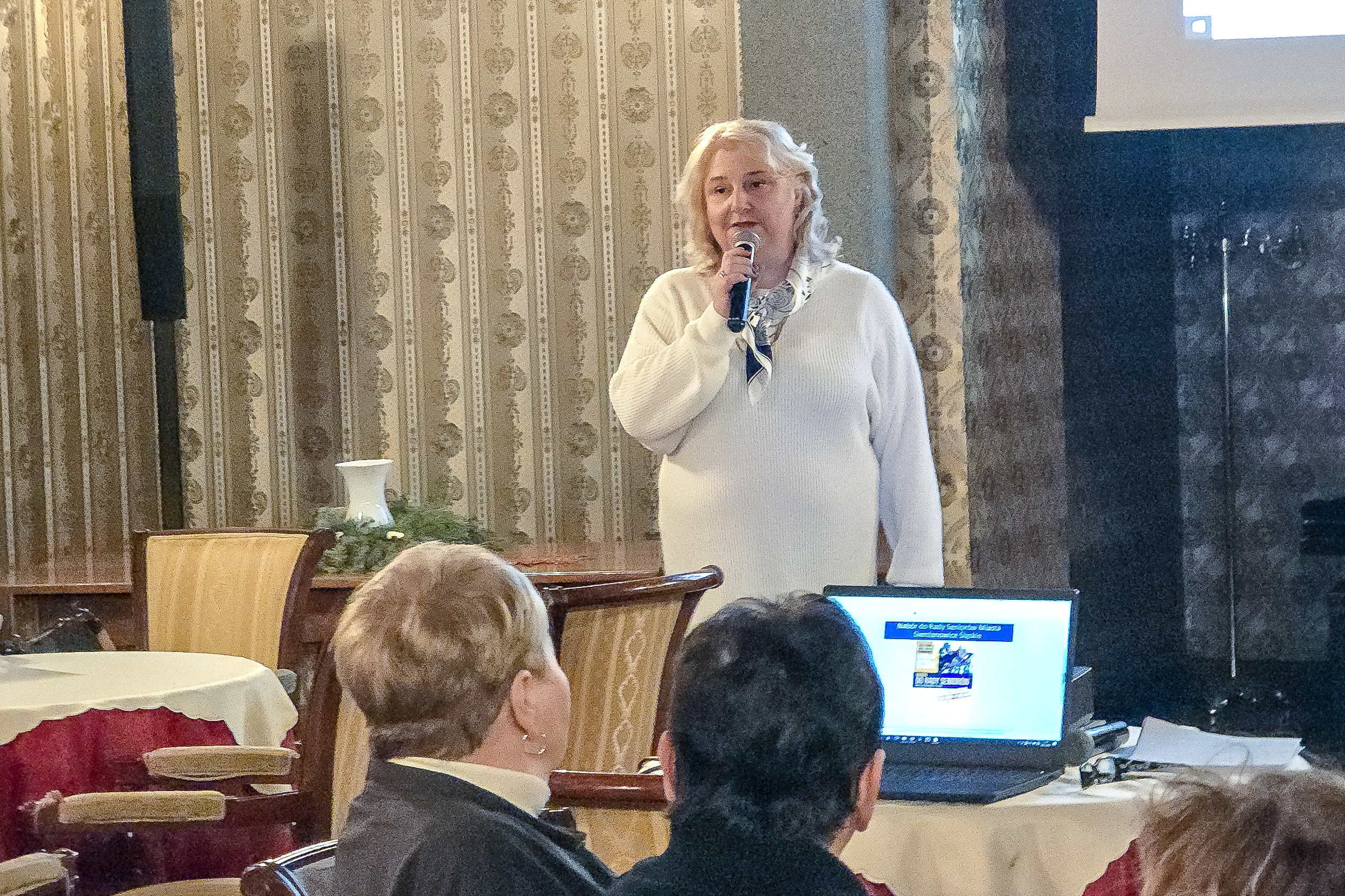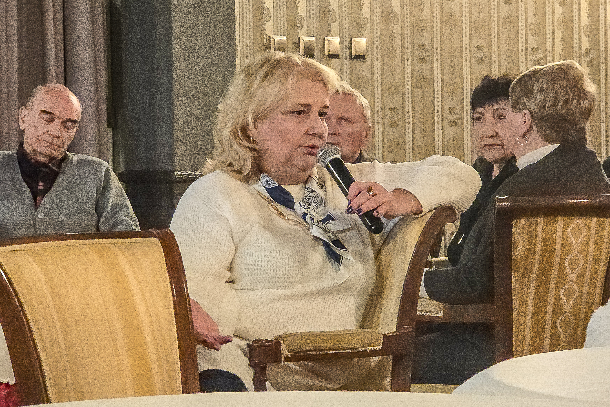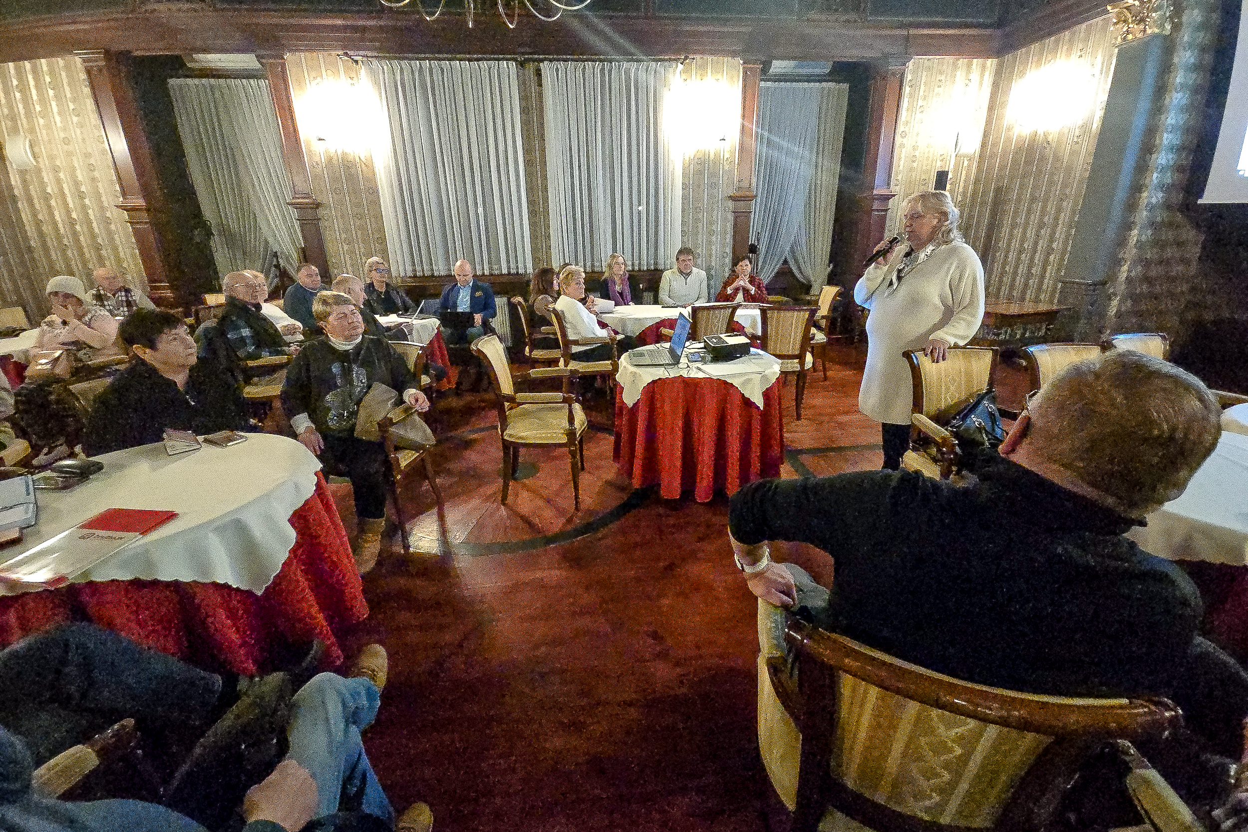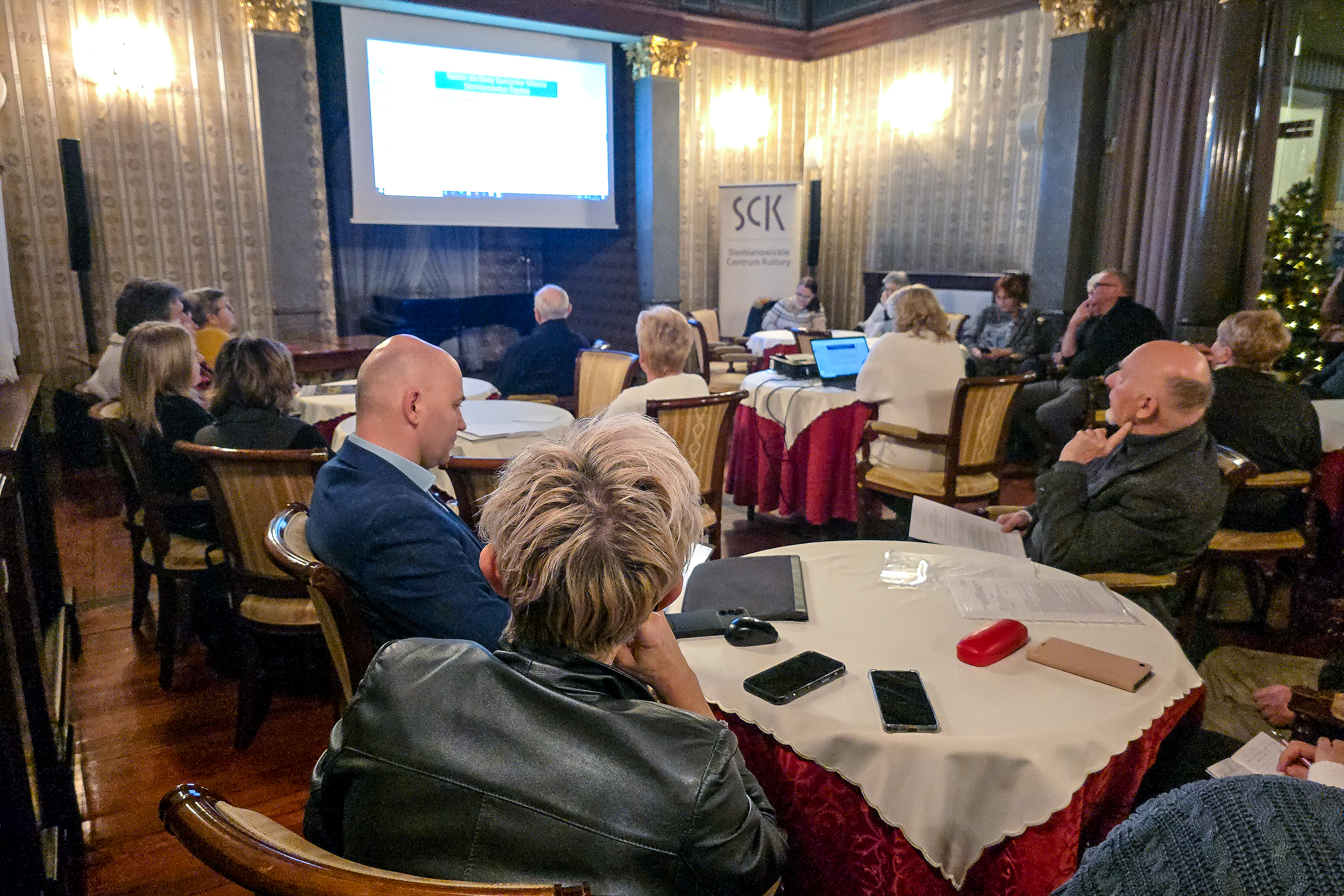 Szeroki plan sali w SCK Willa Fitznera z seniorami zajmującymi miejsca przy stolikach i prowadzącą prezentującą informacje o naborze do Rady Seniorów.