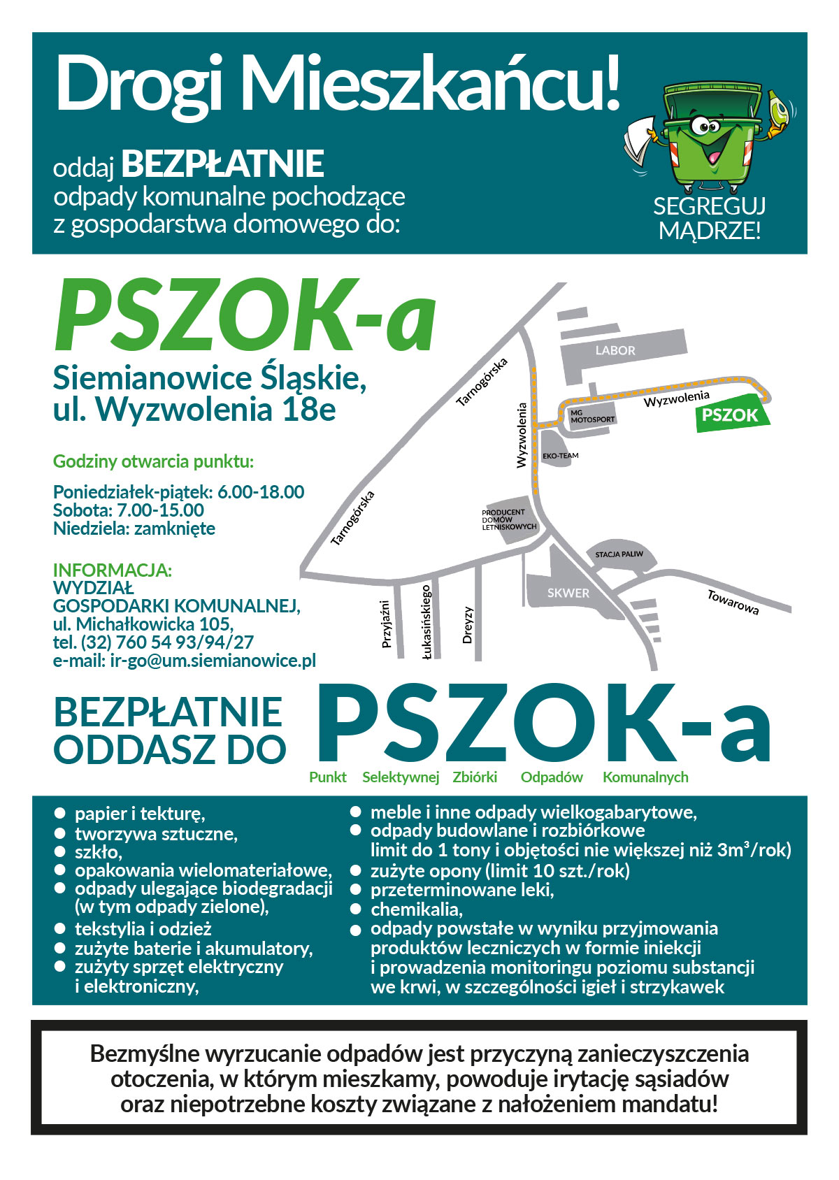 Szczegółowe informacje na temat działalności PSZOKa znajdują się pod linkiem: https://bip.msiemianowicesl.finn.pl/bipkod/042/004/013