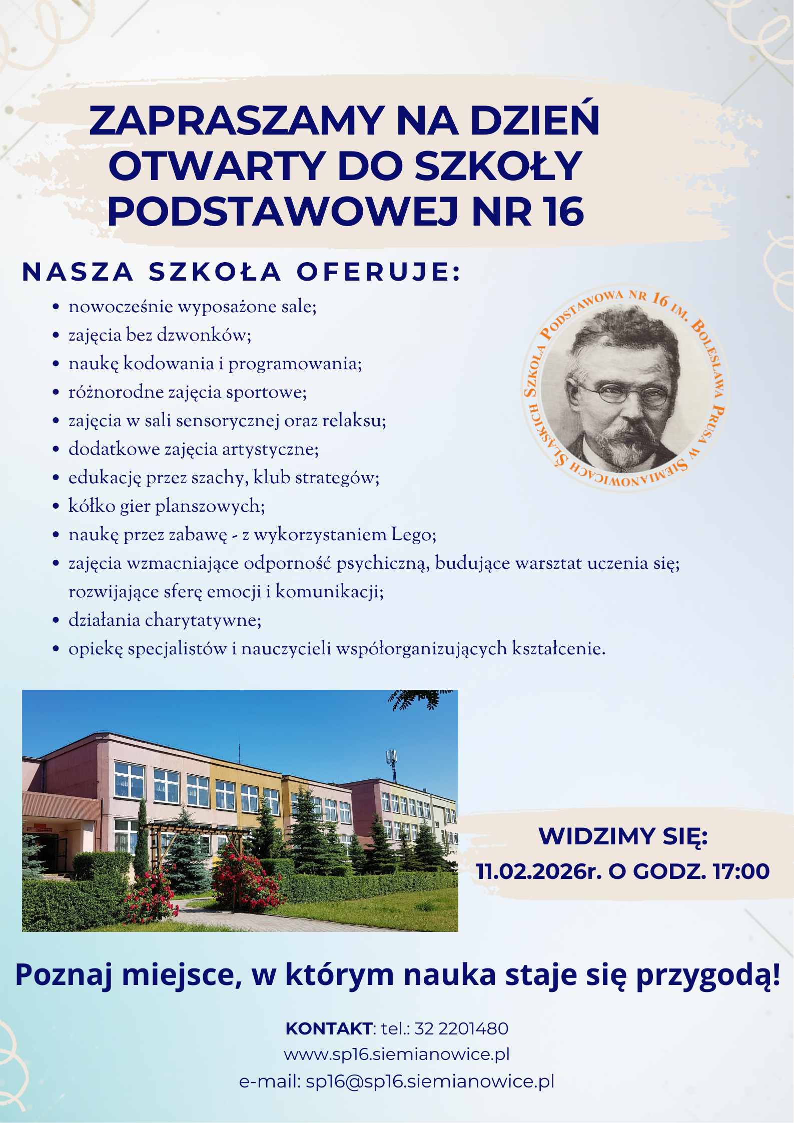 Szkoła Podstawowa nr 16 wraz z oddziałami przedszkolnymi (ul. Karola Szymanowskiego 11) zaprasza rodziców i dzieci na Dzień Otwarty, który odbędzie się 11 lutego 2026 r. o godz. 17:00.