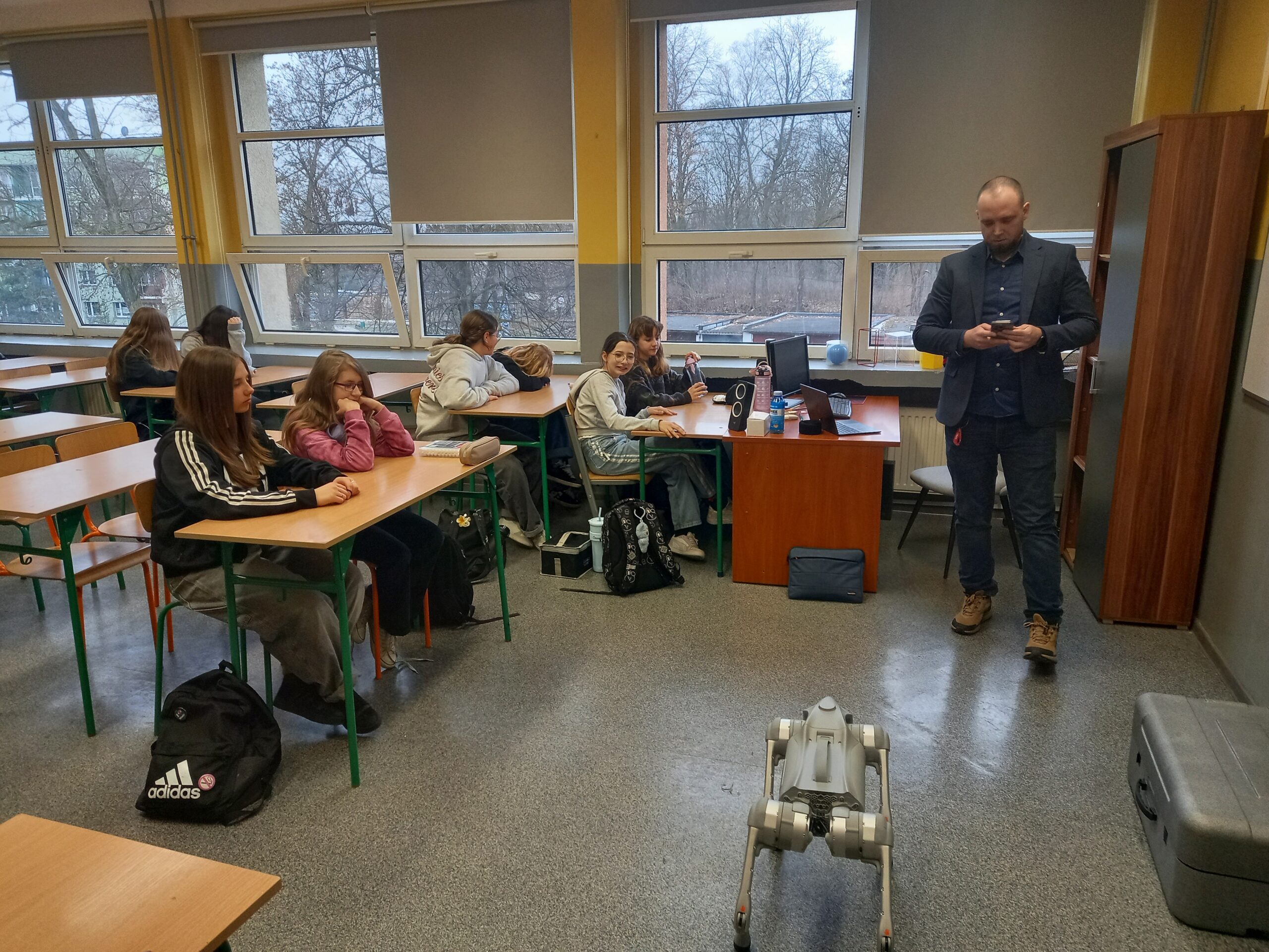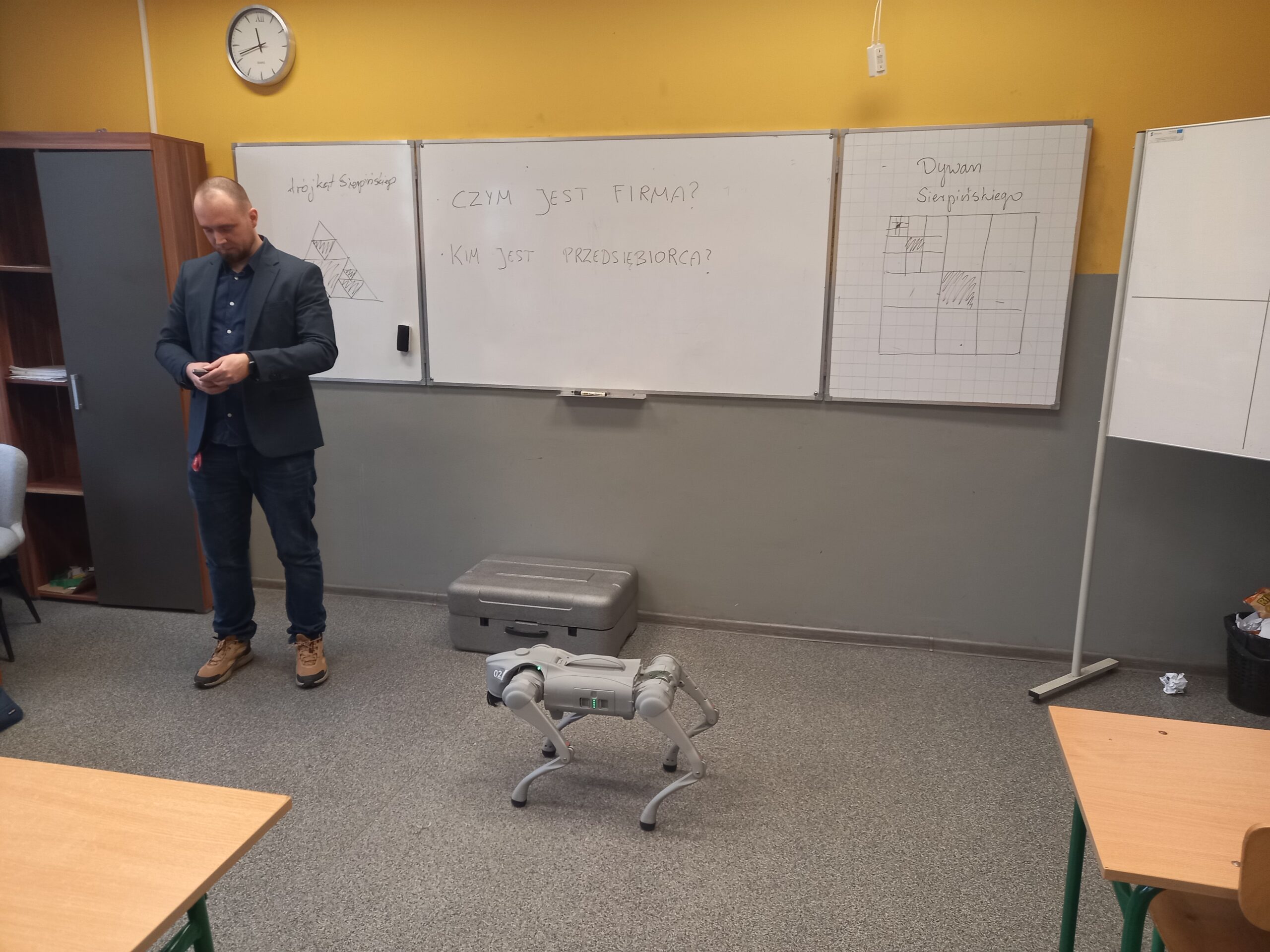 Prawdziwą atrakcją spotkania była prezentacja robota – czworonożnego „psa” UNITREE Go2 Air, który wzbudził ogromne zainteresowanie wśród młodzieży. Konstrukcja zaprezentowała swoje możliwości, takie jak chodzenie, bieganie czy wykonywanie efektownych sztuczek, poruszając się samodzielnie lub za pomocą aplikacji w telefonie. Pokazany model ma charakter demonstracyjny, jednak podobne roboty znajdują już zastosowanie w praktyce.