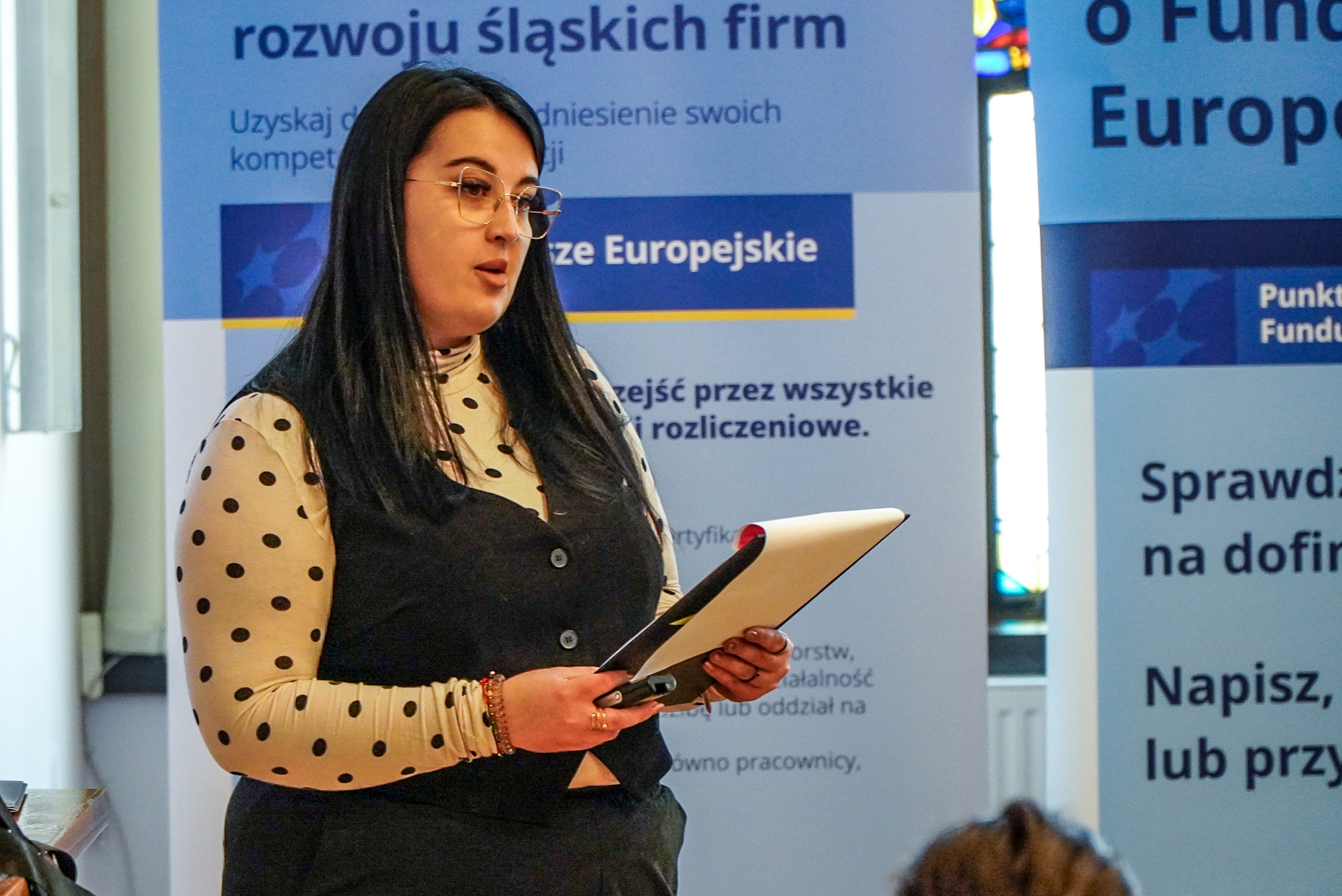 Spotkanie poprowadziła Pani Katarzyna Zapart – specjalista ds. funduszy europejskich z Urzędu Marszałkowskiego Województwa Śląskiego. W trakcie prezentacji omówione zostały najważniejsze instrumenty wsparcia dla sektora MŚP w perspektywie na lata 2021–2027, w tym projekty badawczo-rozwojowe (B+R), innowacje produktowe i procesowe oraz możliwości współpracy z jednostkami naukowymi.