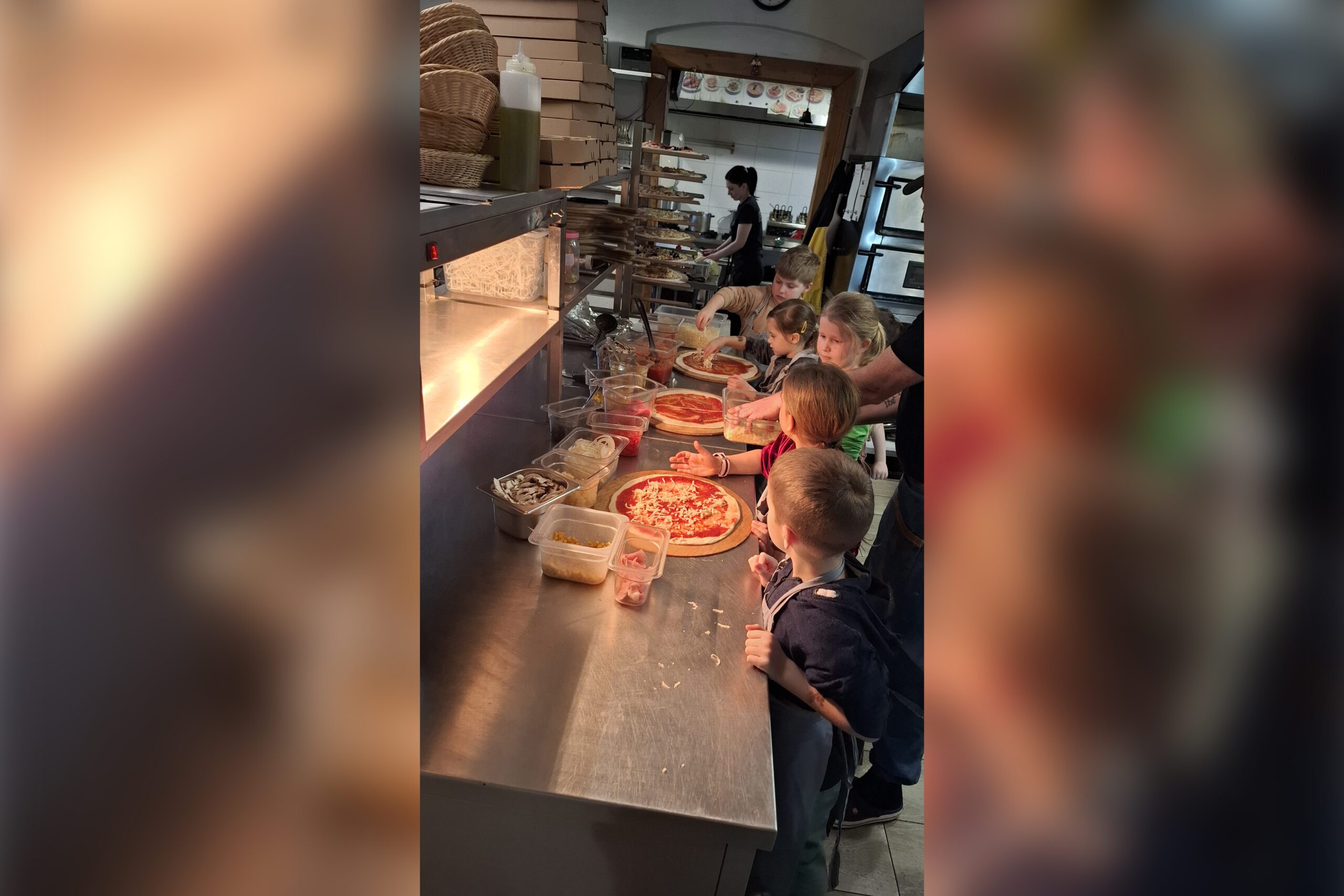 Uczestnicy półkolonii wzięli też udział w warsztatach kulinarnych „Pieczenie pizzy”. Podczas zajęć dzieci miały okazję samodzielnie przygotować pizzę, poznając kolejne etapy jej powstawania – od wyrabiania ciasta, przez dobór składników, aż po pieczenie. Zajęcia rozwijały kreatywność, samodzielność oraz zachęcały do próbowania nowych smaków. Była to również doskonała okazja do integracji i wspólnej zabawy w atmosferze pełnej radości i aromatu świeżo wypieczonej pizzy. Dla wielu uczestników było to pierwsze kulinarne doświadczenie tego typu, które być może stanie się początkiem nowej pasji.