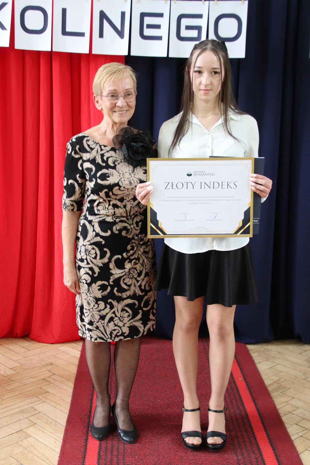 Uroczystość uświetnili swoją obecnością zaproszeni goście: Beata Gałecka, Drugi Zastępca Prezydenta Miasta Siemianowice Śląskie, Małgorzata Kryś, reprezentująca Wydział Edukacji, Alicja Stysz-Adamska, Prezes Oddziału ZNP oraz Jolanta Łozińska-Dudek, Prodziekan ds. nauczania z Akademii Humanitas w Sosnowcu. Złoty Indeks tej uczelni otrzymała z jej rąk Alicja Kaps z klasy 4b. Stypendystką Akademii WSB została natomiast Nikola Witosławska, uczennica od kilku lat osiągająca najwyższą średnią w szkole. Wzruszające spotkanie uczniów, nauczycieli i rodziców było doskonalą okazją do podkreślenia osiągnięć uczniów w różnych dziedzinach – od nauki, przez sport, wolontariat, działalność artystyczną i wiele innych. Najbardziej aktywni zostali uhonorowani dyplomami i symbolicznymi pamiątkami. Niektóre nazwiska pojawiały się wielokrotnie, potwierdzając teorię, że chcieć, to móc. Można się dobrze uczyć, pomagać i realizować swoje pasje na różnych polach, i to jednocześnie! A przy okazji miło być docenionym i widzieć, że ktoś zauważył nasze wysiłki.